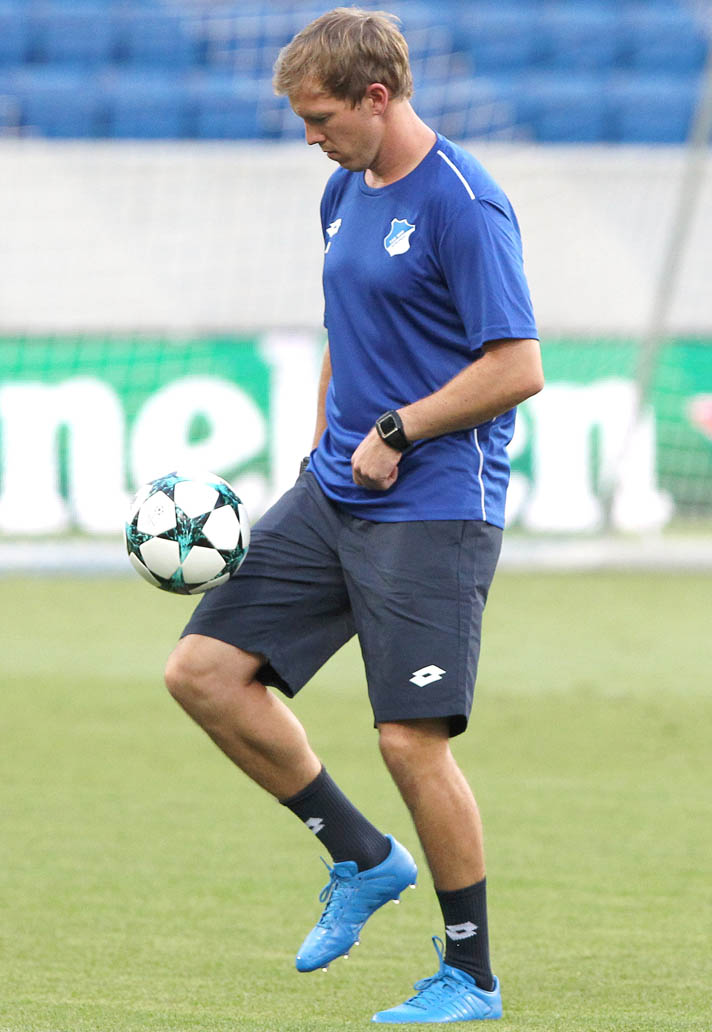Hoffenheim manager Julian Nagelsmann took training in the adidas Gloro 16.1 ahead of his team's Champions League qualifier with Liverpool. Nagelsmann was wearing the all blue edition from the 'Speed of Light' collection that dropped in July 2016.