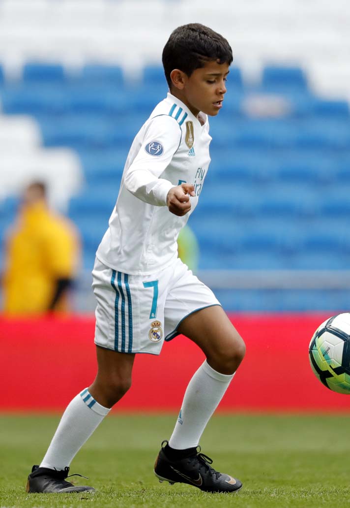 Ronaldo Jr got to have a kick around with his old man after the Madrid derby at the Bernabeu. The youngster was wearing a custom black and gold version of the Nike Mercurial Superfly 360, although his dad looks to have bought them a couple of sizes too big for him to grow in to, while saving a few quid in the process.