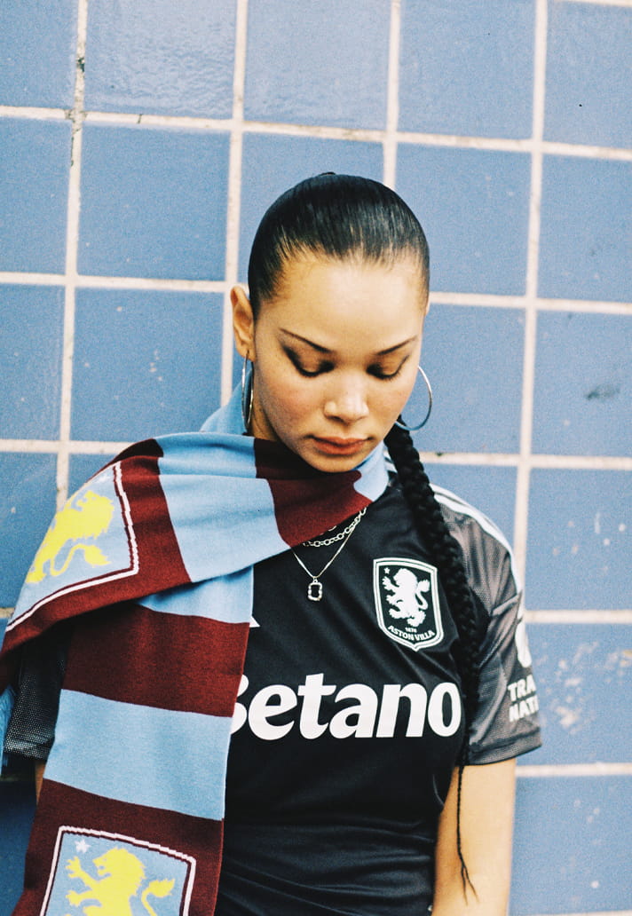 The base lands in deep black, but it’s not flat. There’s movement in the fabrication, subtle shifts in tone across the shoulders, a technical texture that gives the shirt depth without noise. The detailing… cool-toned blues across the upper panels: nods to club identity without overpowering the palette. It’s Villa, distilled.