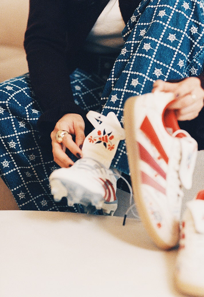 The flower embroidered into the boot is a carnation, Spain’s national flower, symbolising passion and resilience. It ties everything together—the jersey, the lifestyle shoe, and the boot itself. When I finally held the finished pair in my hands, I cried. It felt like the journey from my aunt’s sewing machine in Baghdad had somehow arrived in the heart of adidas’ history.