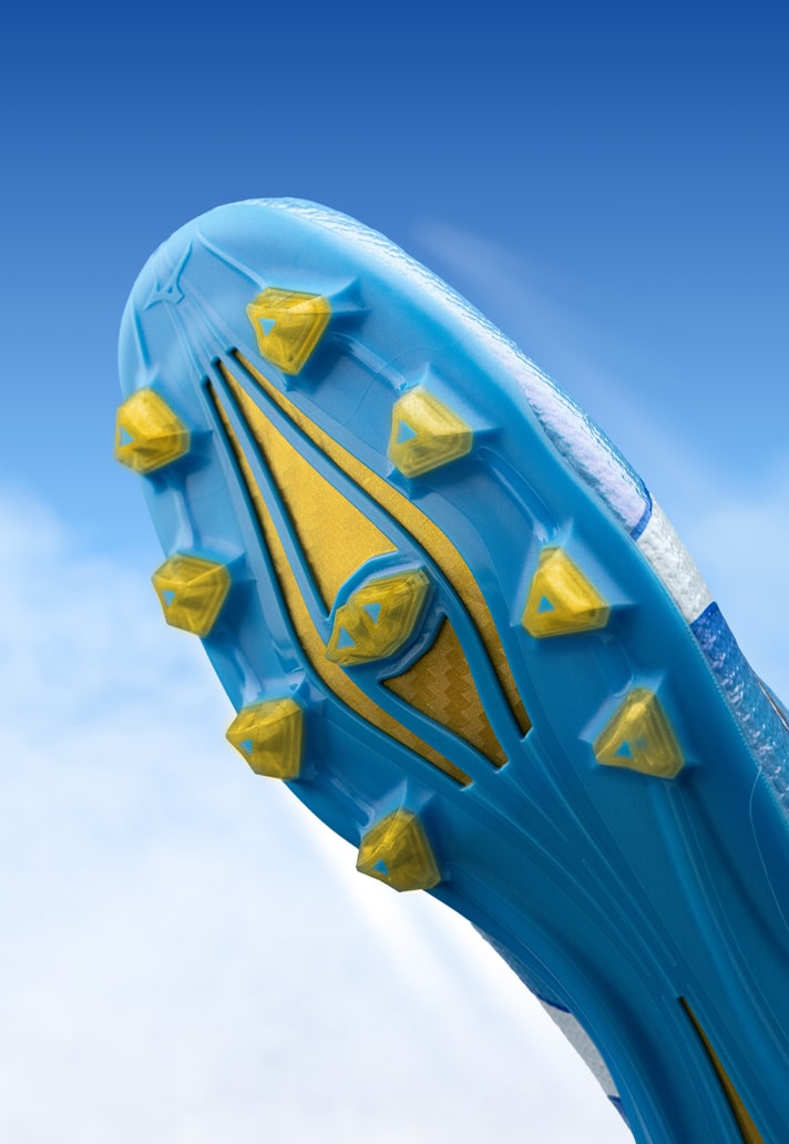 The outsole design remains consistent with the original ALPHA. Prior to ALPHA, Mizuno offered silos such as BASARA, IGNITUS and REBULA. During development, we revisited all of these, but ultimately found the strongest foundation in the highly regarded MORELIA NEO stud layout. From there, we added aggressive α triangular studs to enhance speed and traction. The result is a soleplate that blends tradition with innovation, and one that has been praised by many athletes.