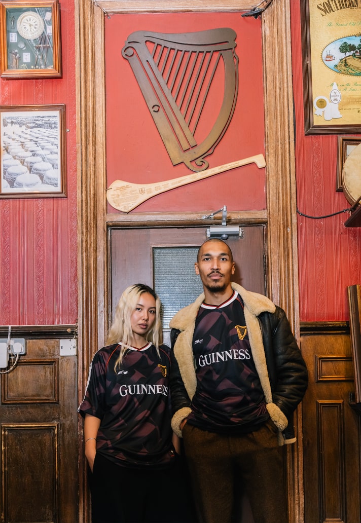 The aesthetic pulls straight from the golden age of early ’90s football design — a period where silhouettes were looser, collars were bolder, and pattern work carried personality rather than polish. Here, those cues are reimagined through Guinness’ visual DNA: a textured “G” motif that rises like the surge in a perfectly poured pint, settling into a deep ruby base tone that mirrors that iconic moment when stout becomes still. It’s colour as storytelling — patience, craft, togetherness, all captured in a single shade.