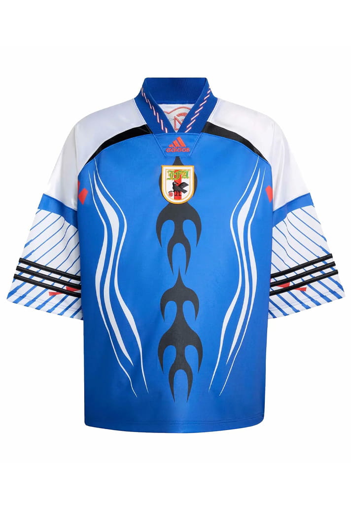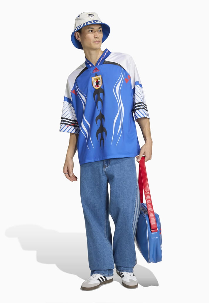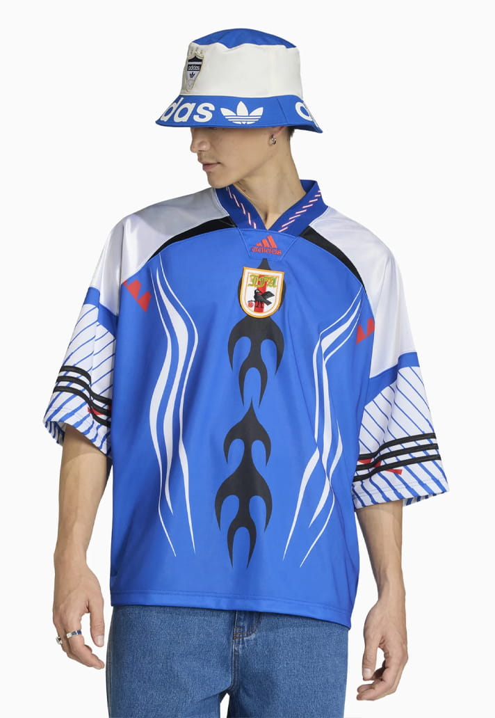 Japan’s offering is pure throwback magic. Inspired by the 1993 and 1998 kits, it arrives in electric blue with tribal flame graphics running straight down the centre. White curved chest lines, intricate sleeve patterns and black stripes combine to make this one of the standout pieces not just in the collection, but across recent lifestyle drops full stop.