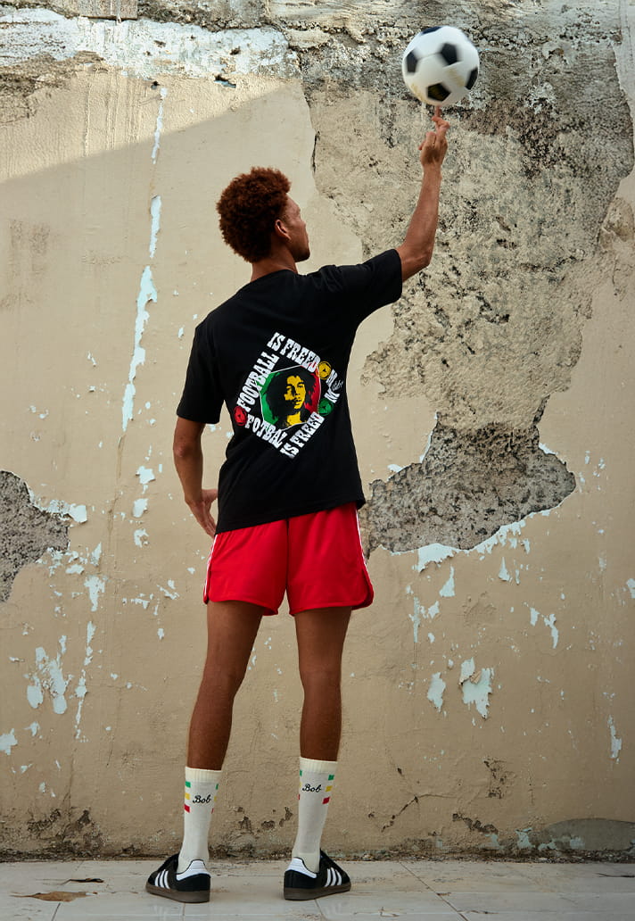 There's a real depth of storytelling woven into every piece from the collection. A flowing wave motif runs across multiple designs, linking the rhythm of Marley’s music with the pulse of Jamaica itself. It’s a pattern that feels alive, almost sonic, reflecting both the gentle roll of reggae and the undulating energy of Caribbean culture. That sense of movement continues in one of the collection’s defining elements: the phrase “Football is Freedom.” Co‑created with The Bob Marley Foundation, the mantra captures Marley’s profound love for the game and his belief in its power to liberate, connect and uplift.