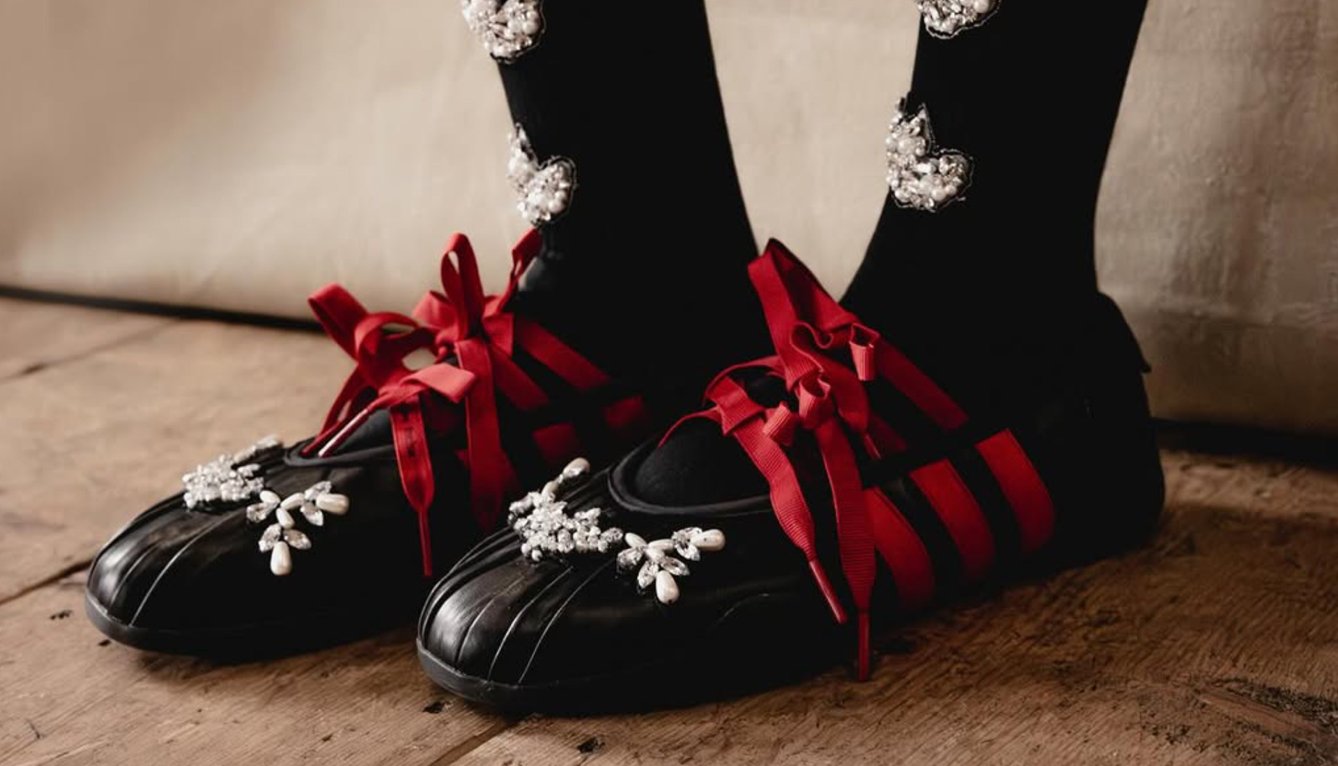 Track tops were sliced with sheer panels and threaded with ribbon lacing, polo shirts carried the posture of classic match-day silhouettes, but were softened with lace trims and sculptural volume, while classic adidas footwear silhouettes received the statement Rocha treatment.