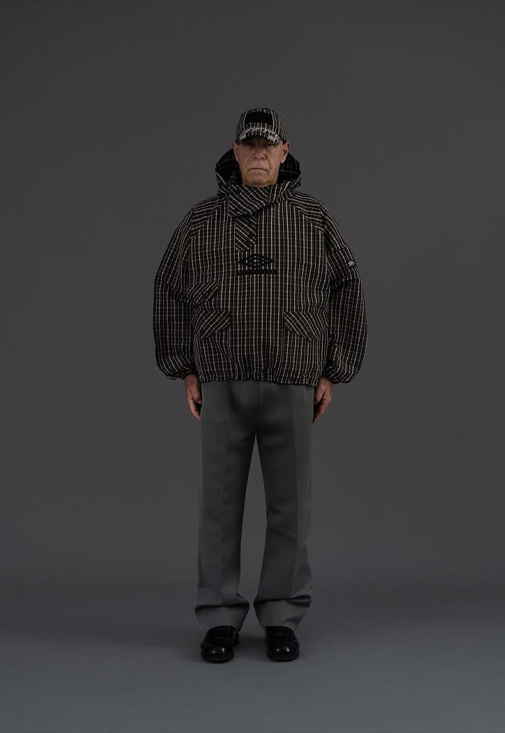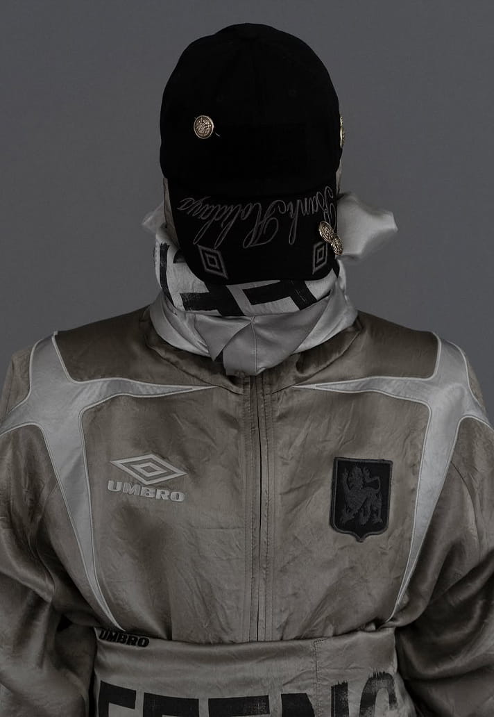 Across the collection, Umbro’s iconic Double Diamond embroidery makes its return, anchoring tracksuits that feel equally at home warming up or navigating city streets. Anoraks and smock jackets are reworked through updated check patterns, adding texture and rhythm without losing their utilitarian edge. And as with the 'Penalty Culture' collection from SS24, there's a clear influence from England’s 2006 Home kit playing out here through the use of the cross on the shoulders of one of the anoraks, harking back to teh execution of the St George's cross from that iconic kit.