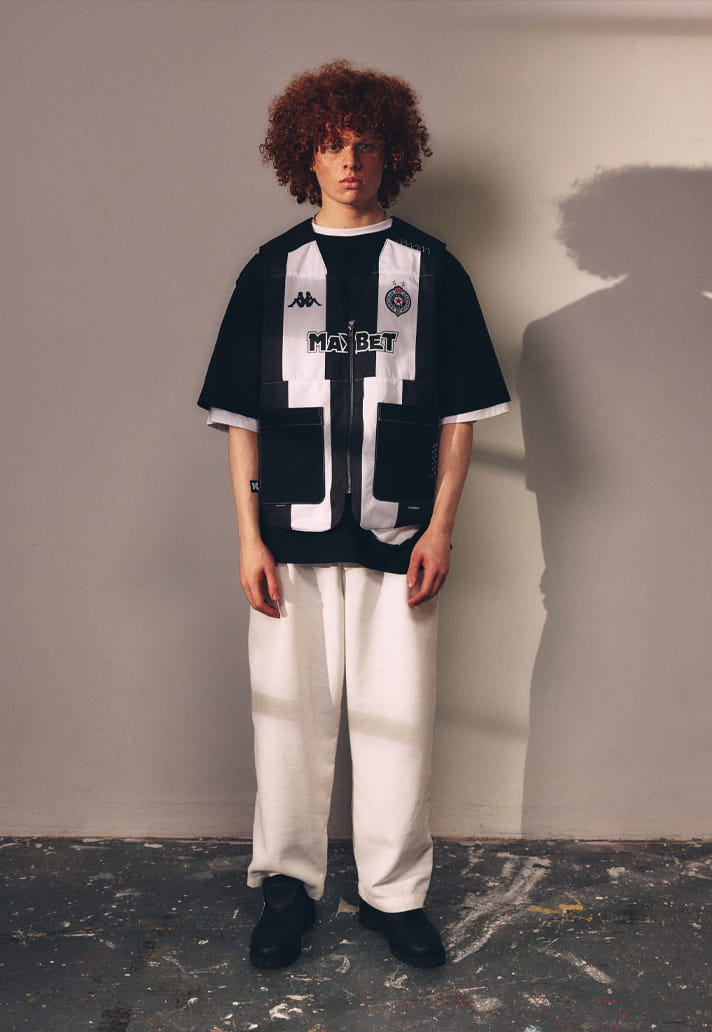 Where Akinola leans into reconstruction through a social and emotional lens, Kiqué Sanchez approaches the project from a more architectural standpoint. Drawing from jerseys worn by clubs such as Red Star FC, Genoa CFC, FK Partizan and OGC Nice, Sanchez offers a contemporary interpretation of sportswear that blurs the line between utility and art. Through deliberate cuts, layering and recomposition, he transforms the jersey into a creative object, one that exists just as comfortably in a gallery or concept store as it does in a stadium.