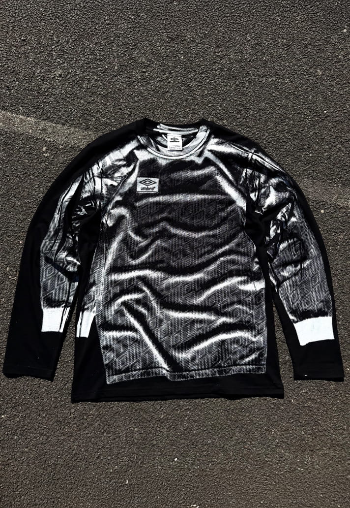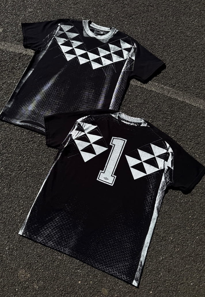 Secondhalf.pdf’s (correct) perception is that goalkeepers exist slightly outside the game. Separate shirt, separate rules, separate responsibility. And it’s this individuality that the collection leans into, reframing it as identity rather than limitation. The creative collective took a fresh and unique approach to the capsule, scanning gloves, stretching prints across panels, pulling details from archival Umbro pieces and reworking them into something familiar and yet skewed through the process. It’s raw, monochrome, unpolished, like it’s been ripped straight out of a magazine.