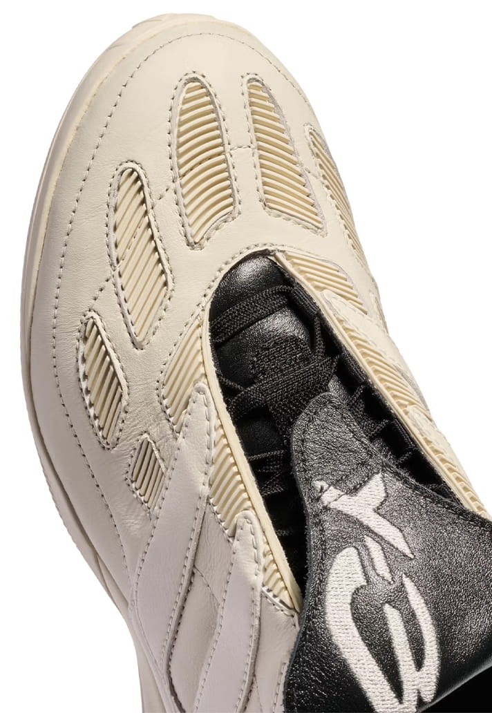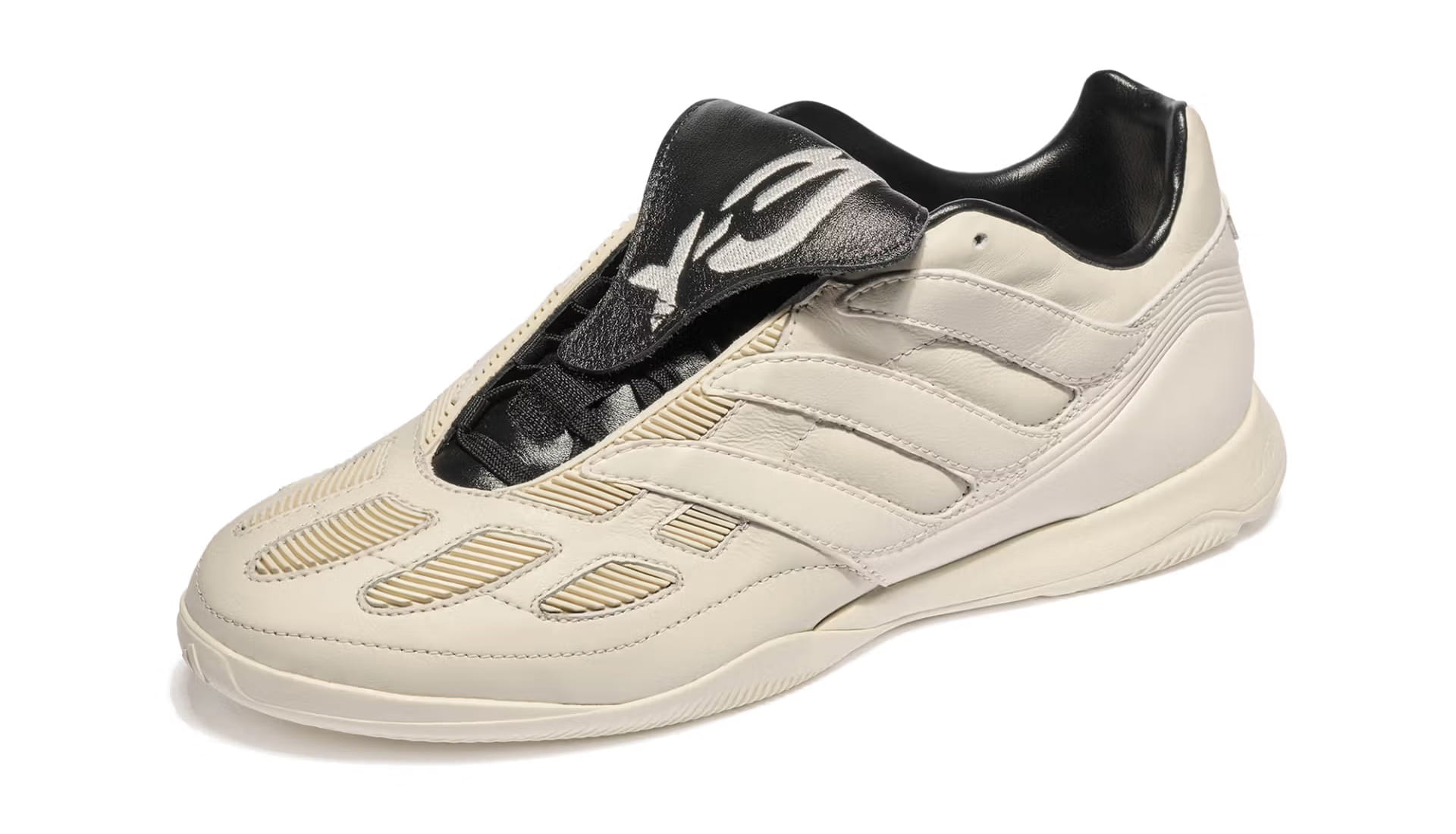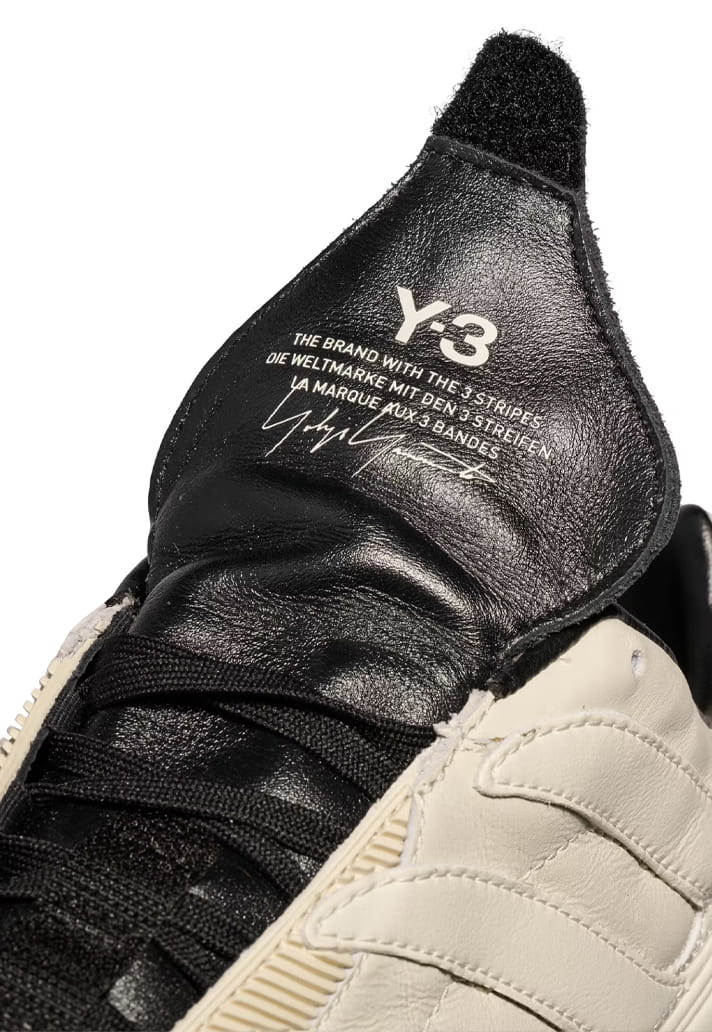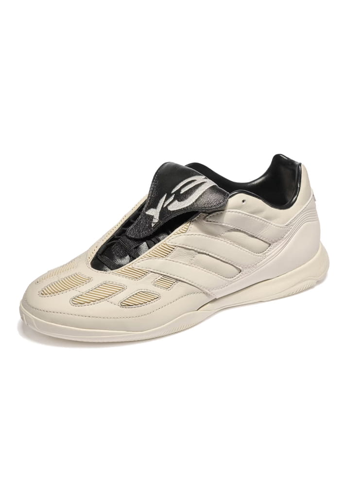 Two colourways define the pack. A full-black option puts the spotlight on the Predator’s sculptural build, letting the folded tongue and layered panelling do the heavy lifting. Alongside it sits a premium off-white pair, leaning into contrast through premium leather uppers and darker tongue detailing — a clear nod to the Y-3 Predator from 2024. Both retain the Precision’s signature DNA: exaggerated forefoot paneling, stitched strike zones and that unmistakable tongue. The difference lies in execution. Branding is kept deliberately low-key, allowing silhouette and construction to speak louder than logos ever could.