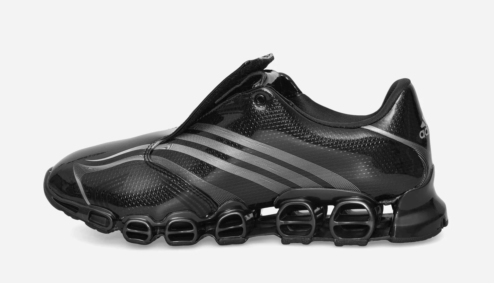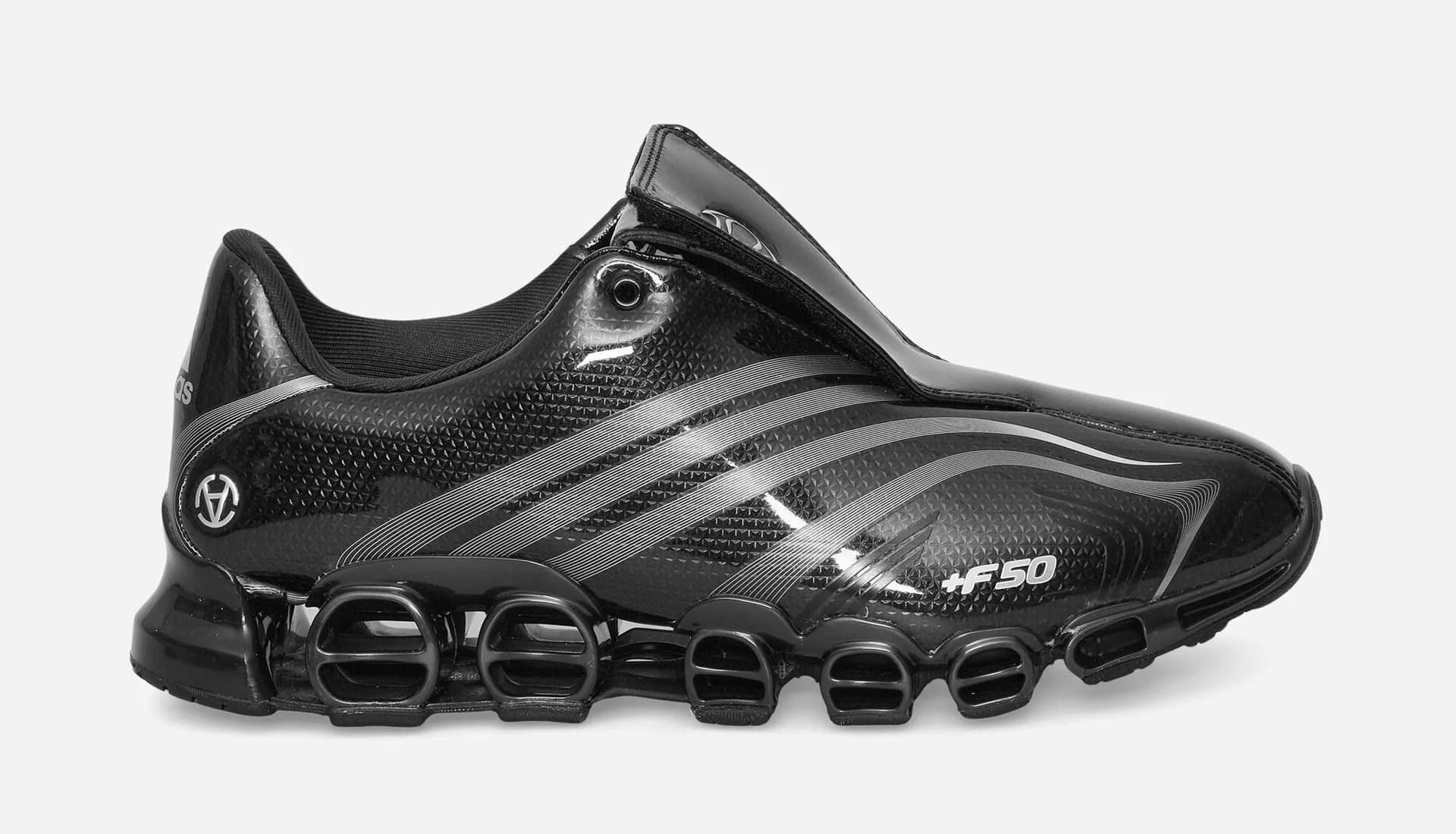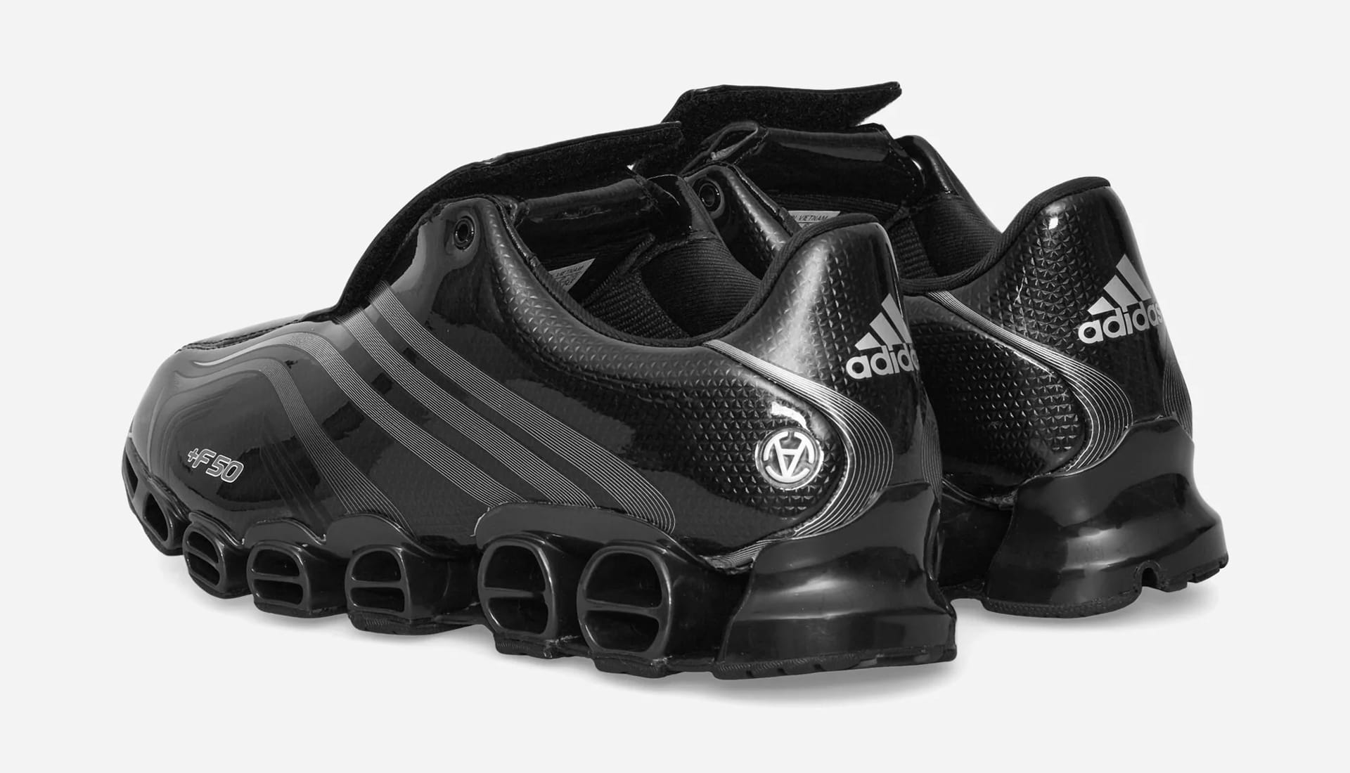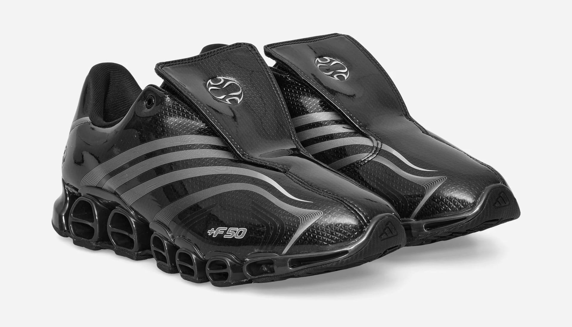 Both colourways — Core Black / Silver Metallic / Core Black and Cloud White / Core Black / Silver Metallic — arrive drenched in a glossy carbon fibre graphic, nodding to the original speed aesthetic that defined the F50 era. Light grey Three Stripes and +F50 branding keep things clean, while a Slam Jam logo stamped on the lateral heel quietly signs off the collaboration. It’s football nostalgia, but refined — polished just enough to feel right in today’s landscape.