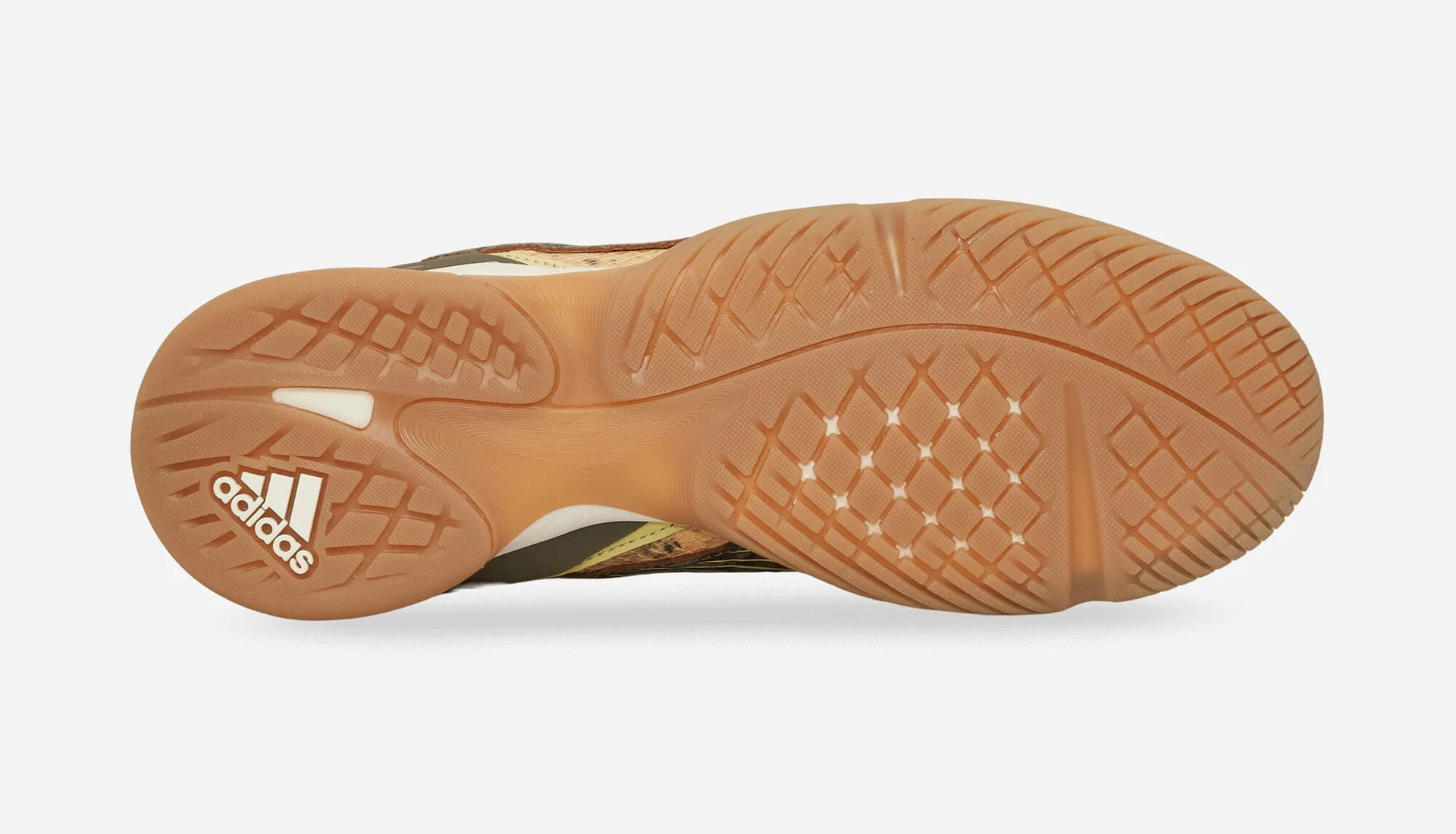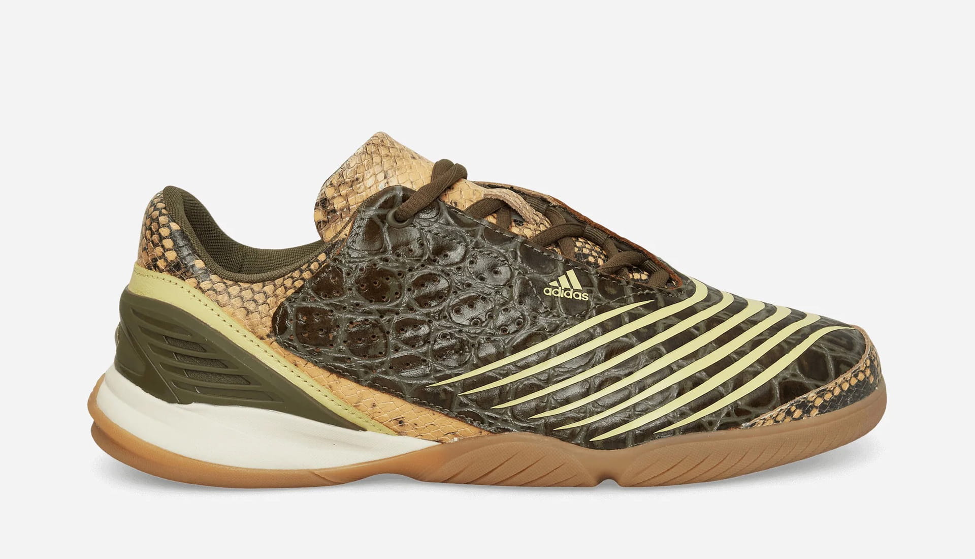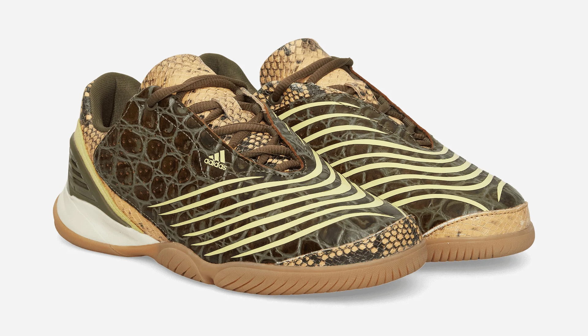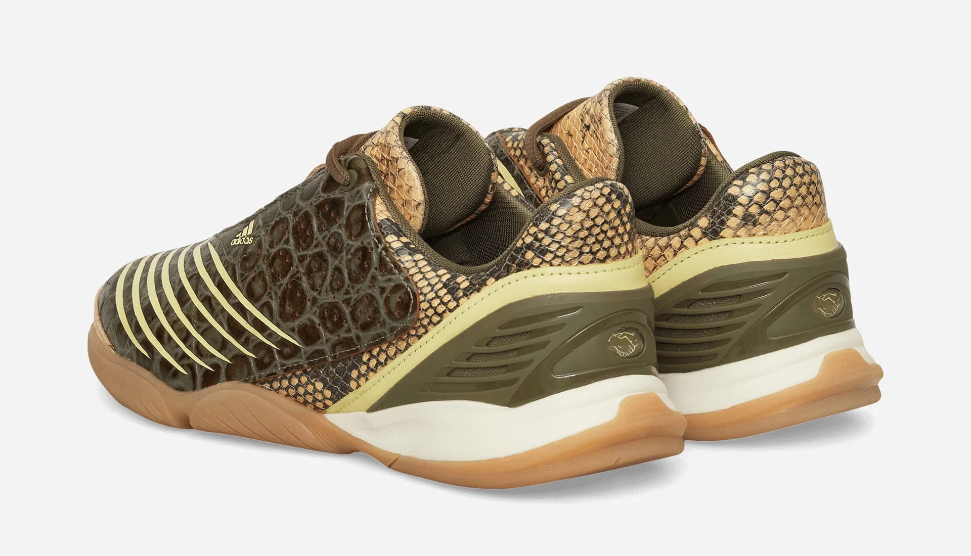Meanwhile, the Powder Yellow / St Fade Ocean / Dark Cargo iteration goes wild with texture. A snakeskin-stamped upper blends beige, tan, and brown tones, contrasted by yellow lines racing across the medial side and toe box. Finished with gum and translucent outsole elements, it’s a shoe built to move effortlessly from pitch-side to party.