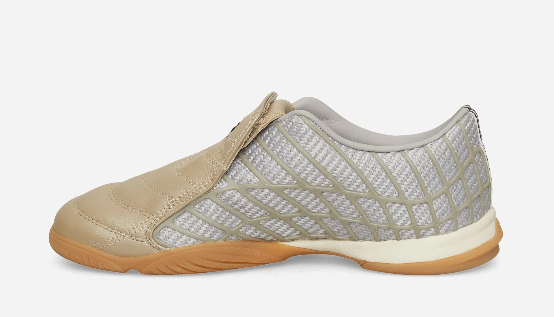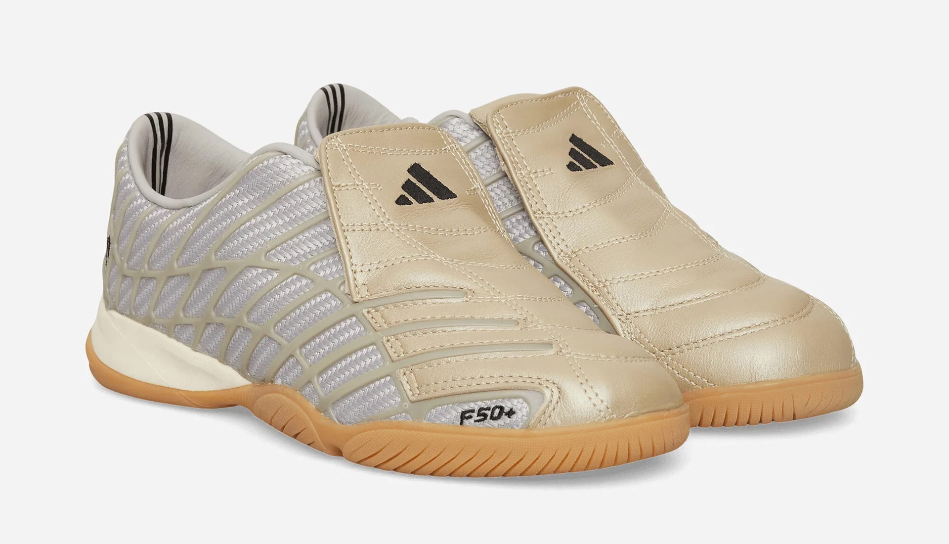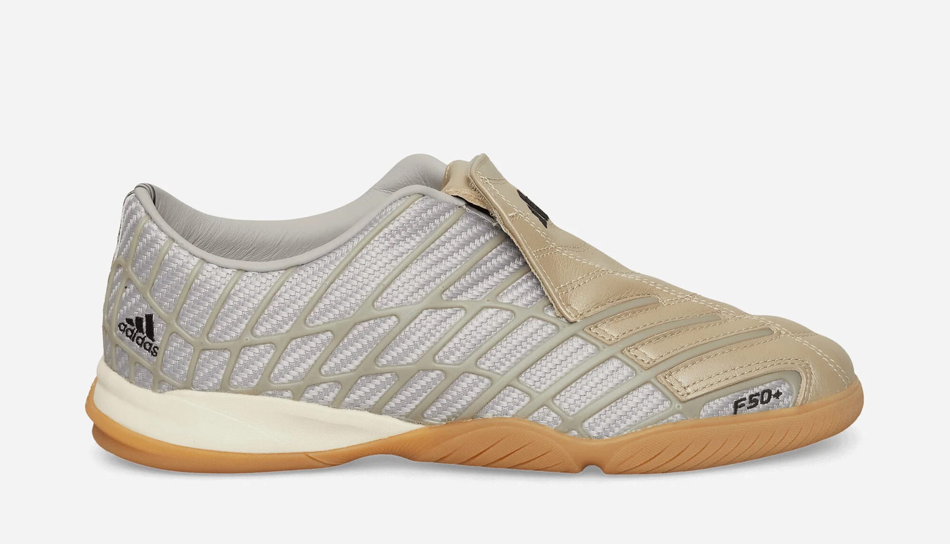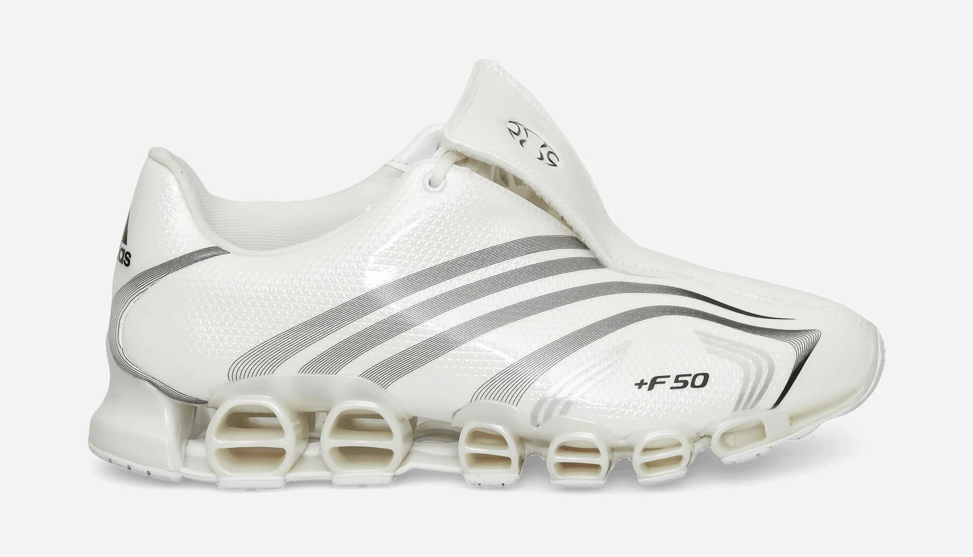 The Silver / Clear Granite / Cream White colourway reimagines the legendary F50 Spider boot, featuring a bold gold shield across the lace panel and a metallic structural weave layered over grey mesh side panels. It’s unapologetically expressive, leaning into the design language that made the F50 an icon in the first place.
