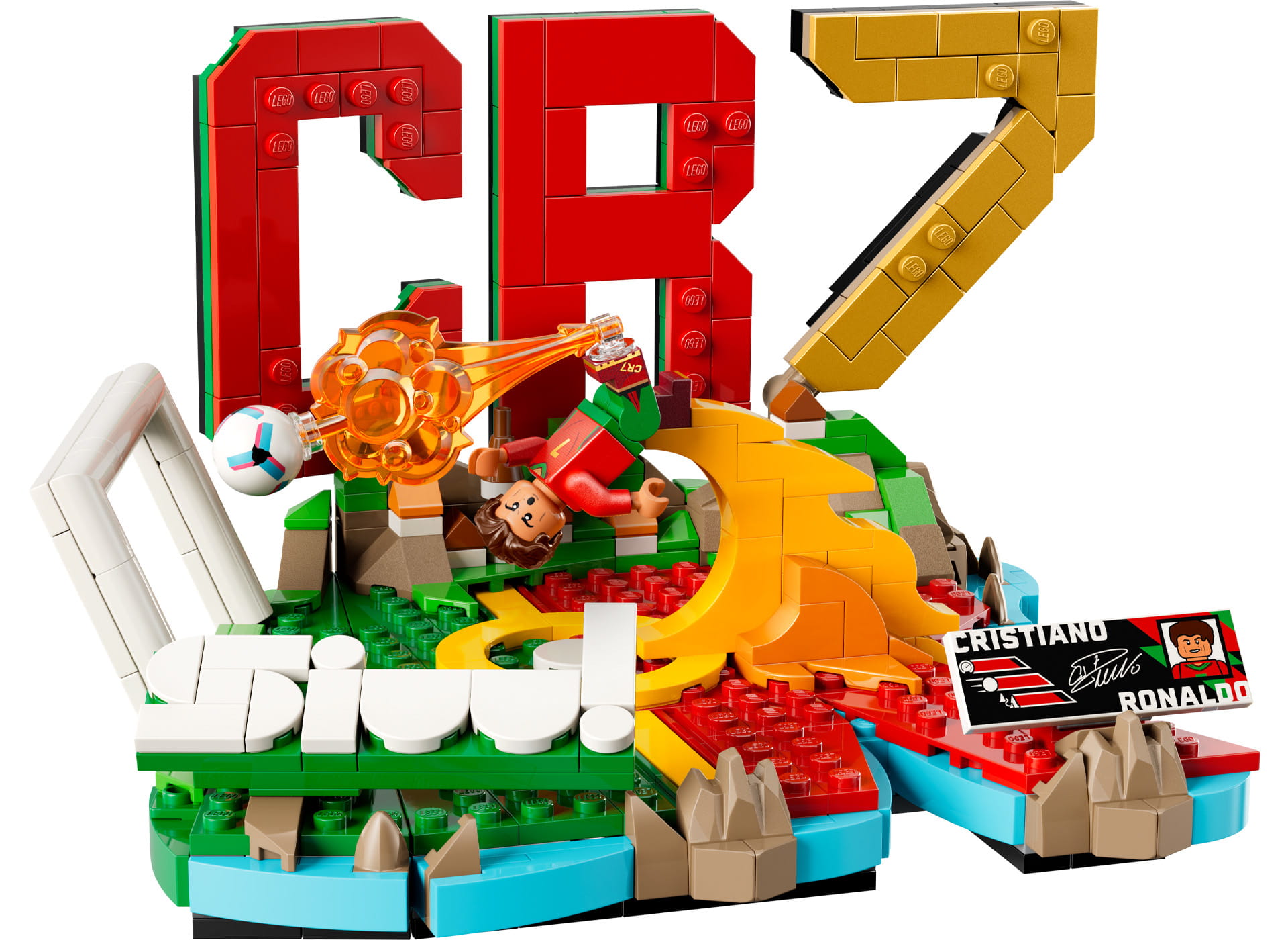 The 854-piece CR7 model can be built with Ronaldo in the explosive “Siuuu” pose or with him performing his iconic bicycle kick. The model features a larger CR7 backdrop, a printed plaque and a brand-new co-moulded face and new football ball element.