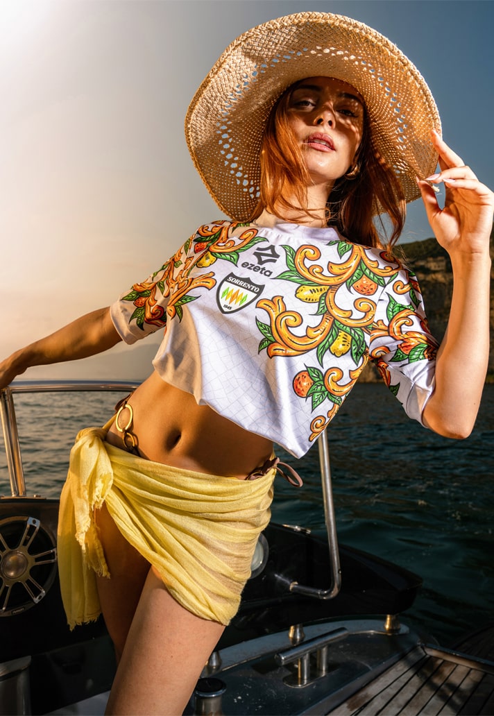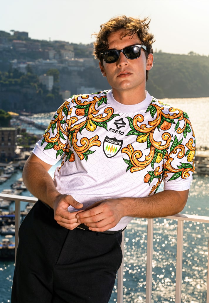 The shirt is washed in bright tones: lemon yellow, citrus orange, and pure sunlit white. It's a visual ode to the Sorrentine Peninsula’s coastal palette, capturing the breezy elegance and lush bounty of the region. Ezeta doesn’t just reference local culture; they bottle its essence and let it pour through the jersey.