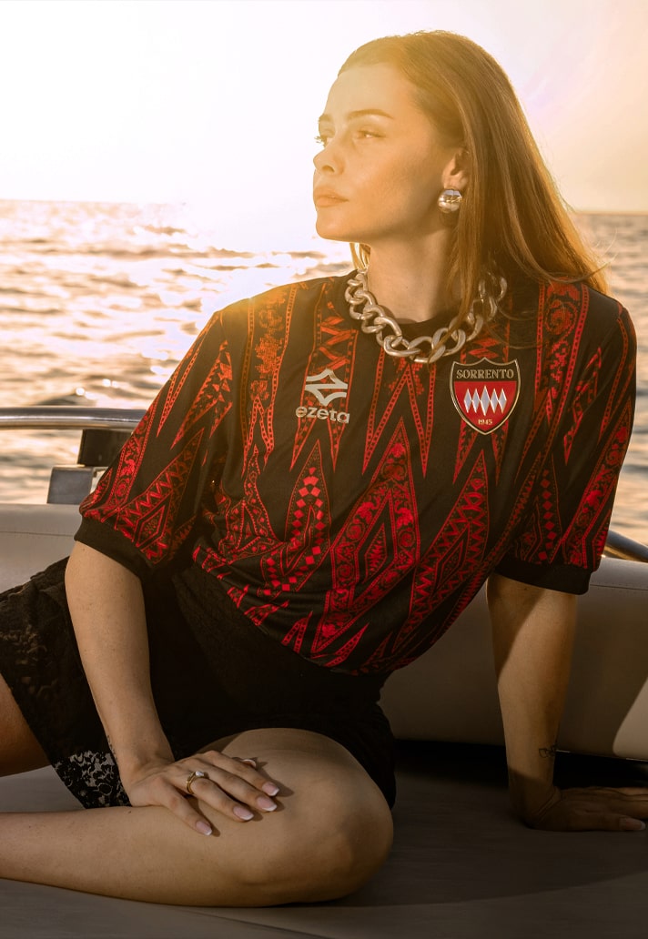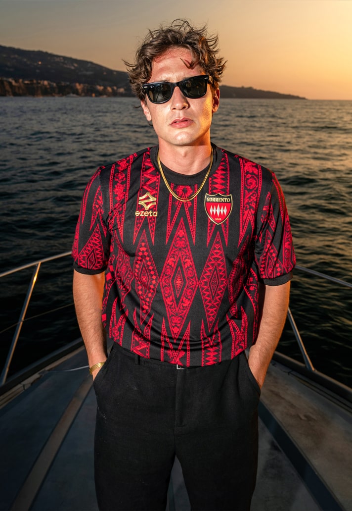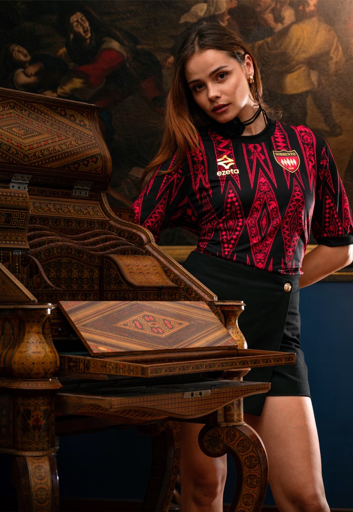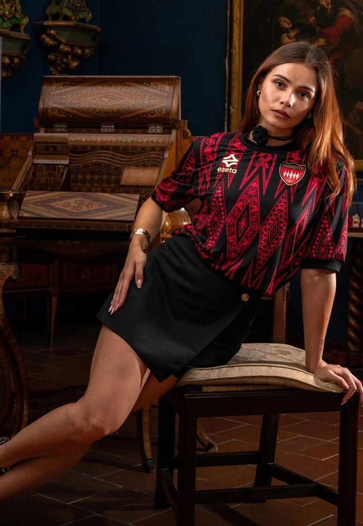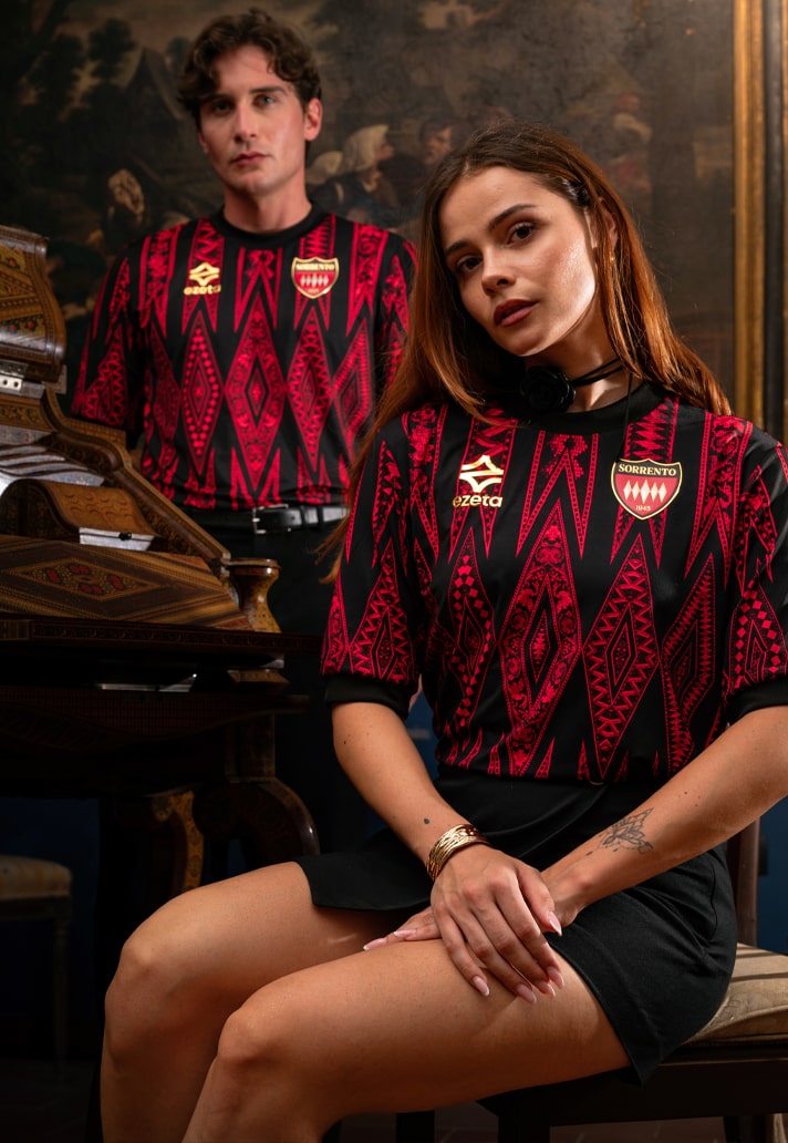 The home shirt hits with a powerful blend of tradition and finesse. Red and black stripes, core to Sorrento’s identity, are elevated by a pattern that honours the ancient Neapolitan art of wood inlay. Dig deeper and you'll find echoes of a 20th-century writing desk housed in Sorrento’s Correale Museum — a detail so niche, so Ezeta.