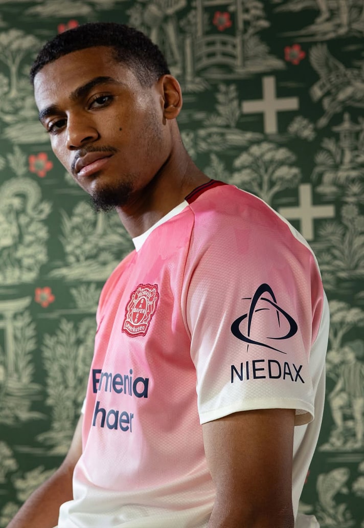 Adding to the depth, subtle floral shadow graphics bloom across the body, a detail that speaks softly but carries weight. It's a nod to the local, the lived-in, and the quietly revered. More than a kit, it’s a wearable map of Leverkusen’s story.