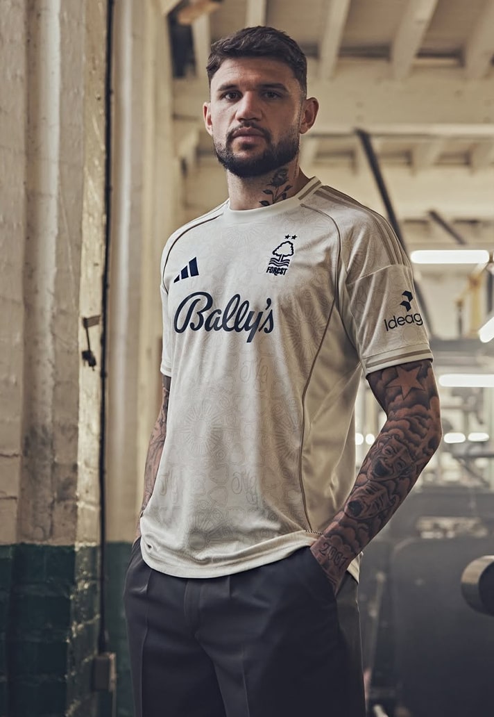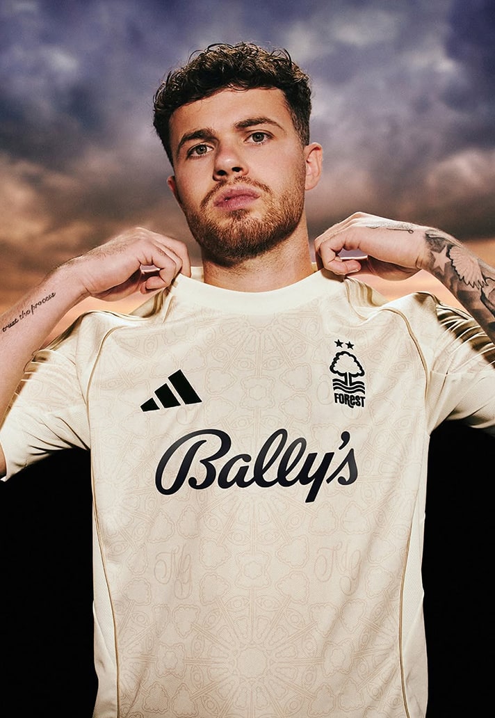 This shirt is one of the cleanest looks of the season. A soft off-white base acts as the canvas, whilst the detailing is really what catches the eye. An embossed pattern blends two symbols of Forest identity, featuring the iconic club crest fused with the postcode of the iconic home stadium. Woven together, they form a bespoke design that perfectly balances aesthetics with pride. Forest through and through. Celebrating the rich lace legacy of the city, two lace-inspired hems frame the whole design around the shoulders and sides of the piece. Front and center sits the logo Forest’s new shirt sponsor, Bally’s, marking the beginning of another chapter. And can we just say, that sponsor perfectly completes the look. The definition of a sponsor looking good on a kit.