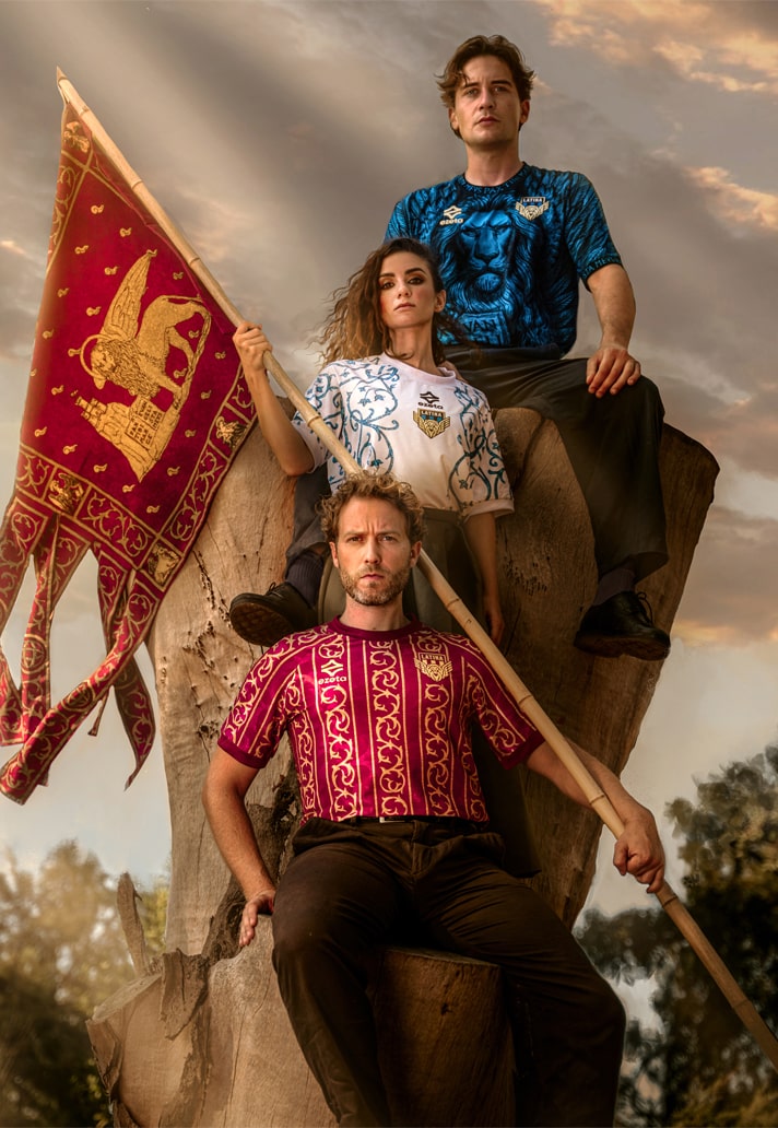 Then there’s the third kit – a striking piece drenched in deep crimson red and trimmed with gold. Its look references the golden flames of the Venetian flag, a motif synonymous with strength and justice. Bold in colour and powerful in symbolism, it’s a kit designed to stand out both on and off the pitch.
