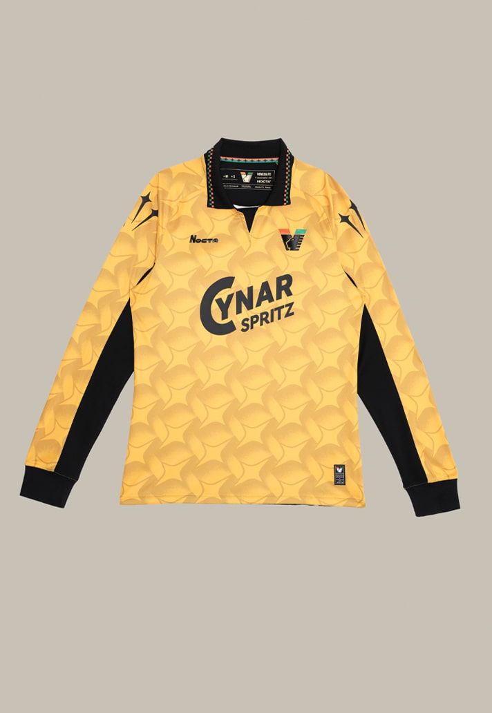 The 25/26 Goalkeeper Home Jersey brings gold back into play, instantly bringing the third shirt from the 22/23 season. It also comes draped in NOCTA’s signature star pattern — a subtle constellation inspired by the night sky above the lagoon. The luminous base is broken only by a bold black “Venezia” wordmark, club crest, and NOCTA mark. In true homage to the era it references, it comes only in long sleeves, and is available in both lifestyle and match editions, the latter featuring Cynar Spritz branding.