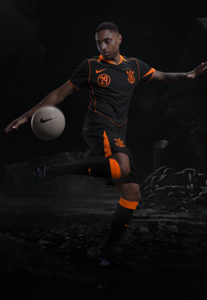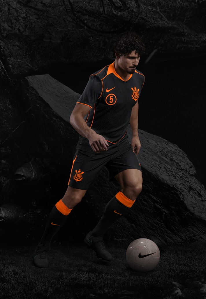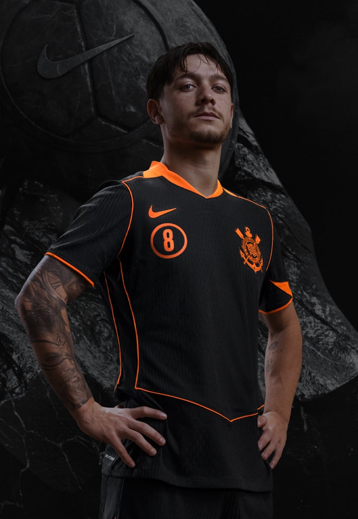 Launched under the banner “Total Corinthians”, the design of the club's new third shirt is a time machine. Entirely blacked-out, the it carries bold orange accents — a Swoosh to the right of the chest, the Corinthians crest rendered in the same striking hue, and sleeve and collar trims that nod directly to the 2005 template. The iconic Total 90 circle reappears, housing the player number beneath the Swoosh, with a reworked font drawn straight from the mid-2000s. Inside the collar, the “T90” insignia sits at the nape, a subtle stamp of one of Nike Football’s most influential eras. Black shorts and socks with orange detailing complete the blackout aesthetic.
