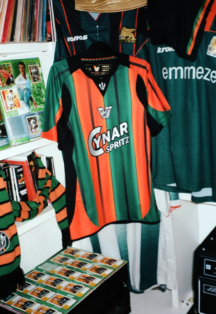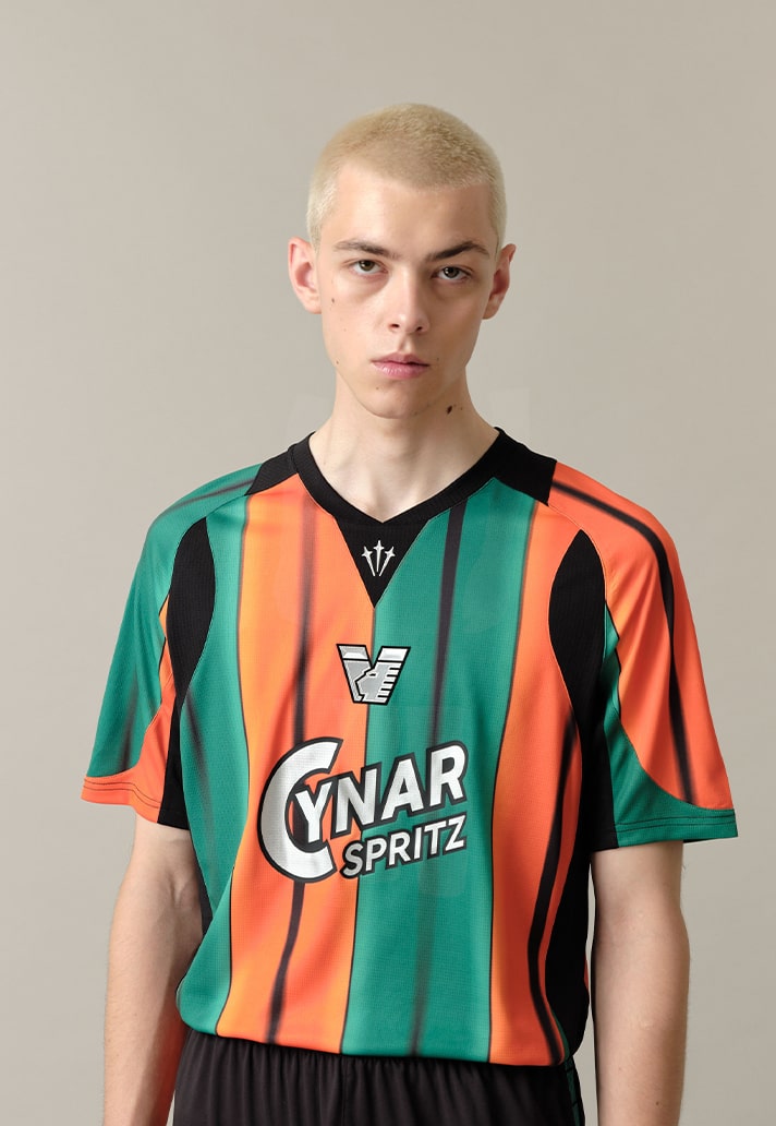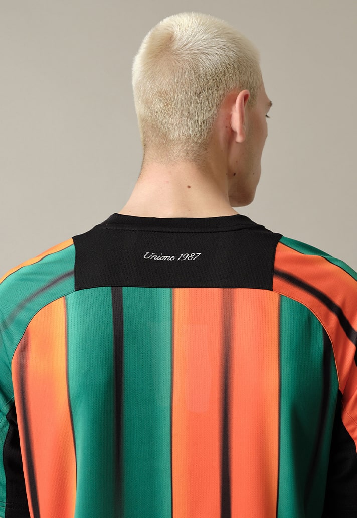 Created by Diego Moscosoni and Ariel Mojetta, the design revives Venezia’s iconic colours in unapologetic style. Bold vertical stripes of orange, black, and green dominate with a modern edge. The late ‘90s and early 2000s terrace aesthetic runs deep here but sharped for the now. An archival energy elevated with contemporary finesse. Orange and green bands cut through the shirt, framed by a black gradient detailing that simply adds depth and texture. Across the chest, a metallic silver sponsor stands strong, whilst the club crest and Nocta logo shimmer in the same silver light. All of which have been placed in the centre of the shirt, once again pointing towards that retro aesthetics.