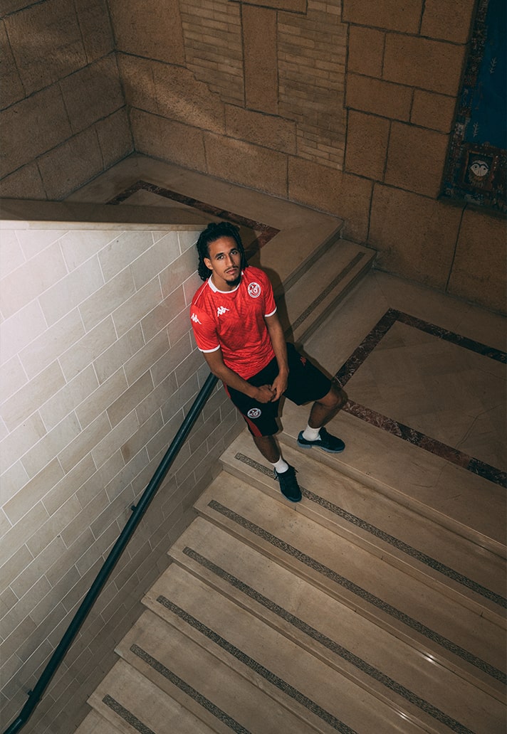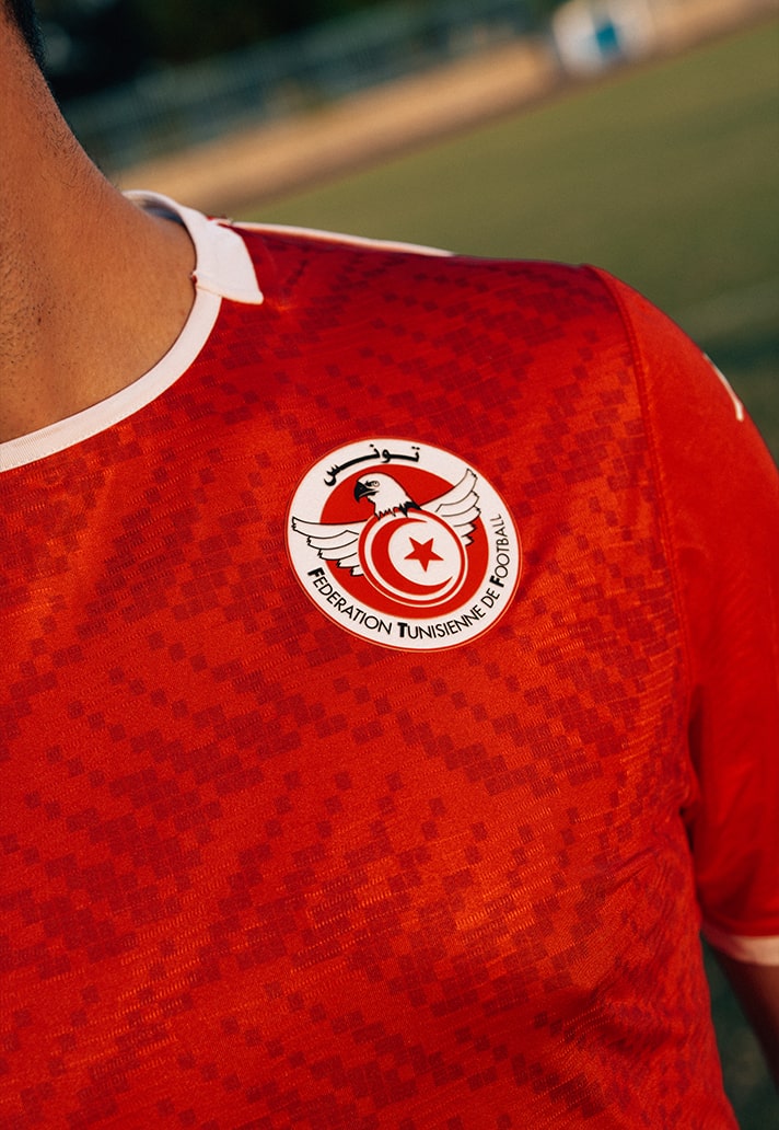 Leading the line is the red home shirt — a bold, powerful statement piece that channels the energy of the Mediterranean. Its tonal graphic, echoing Roman mosaics, brings waves to life across the fabric — a nod to Tunisia’s history as a crossroads of cultures and a nation shaped by the sea. The result is a kit that feels alive with motion and meaning, perfectly tuned to the spirit of the Carthage Eagles.