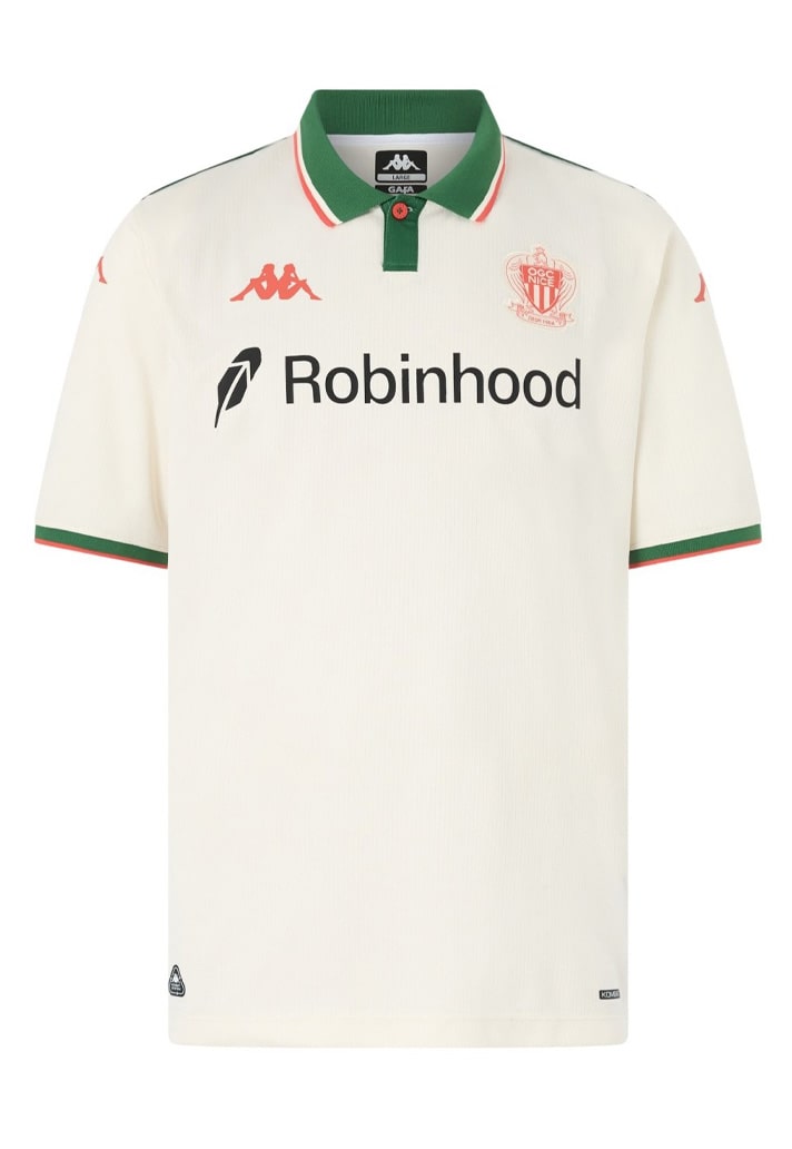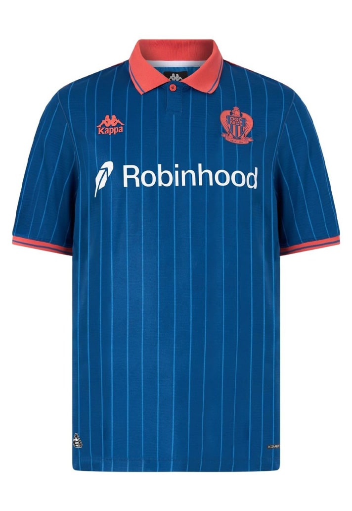 Right, trying really hard not to lean into the easy puns around the club name here… OGC Nice and Kappa really have smashed it this season. Traditional polo collars are the order of the day, and all three designs differ wildly, but each hit so hard. The home goes bold with thick black and red stripes, the away opts for a beige base with green accents reminiscent of Liverpool’s 21/22 away, and the third lands with a blue base, fine pinstripes, and red detailing. You’d want any one of these for your club. Ah, go on then — it’s just really Nice.
