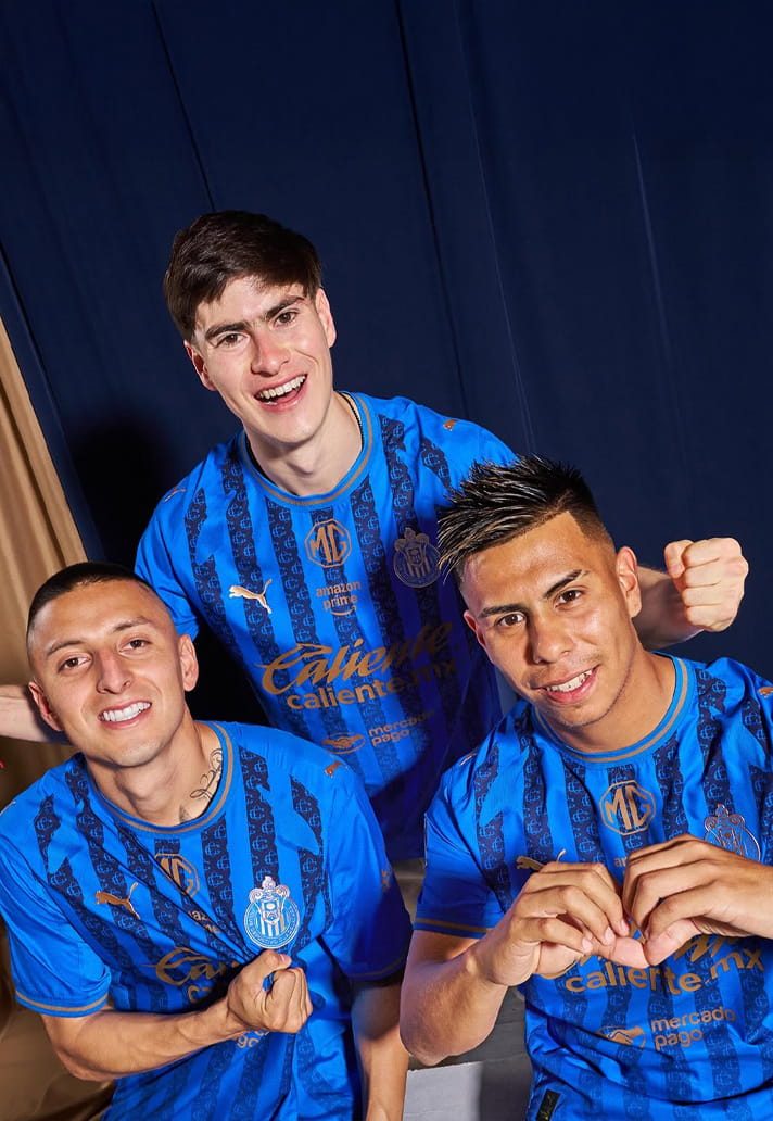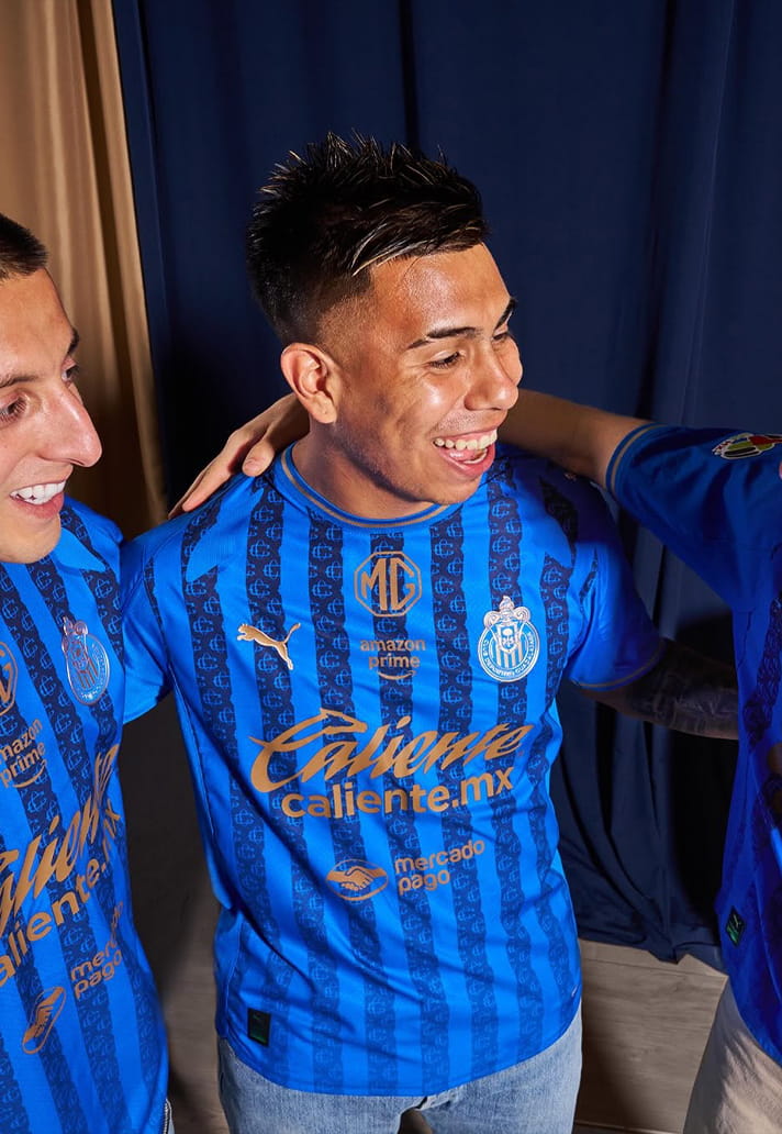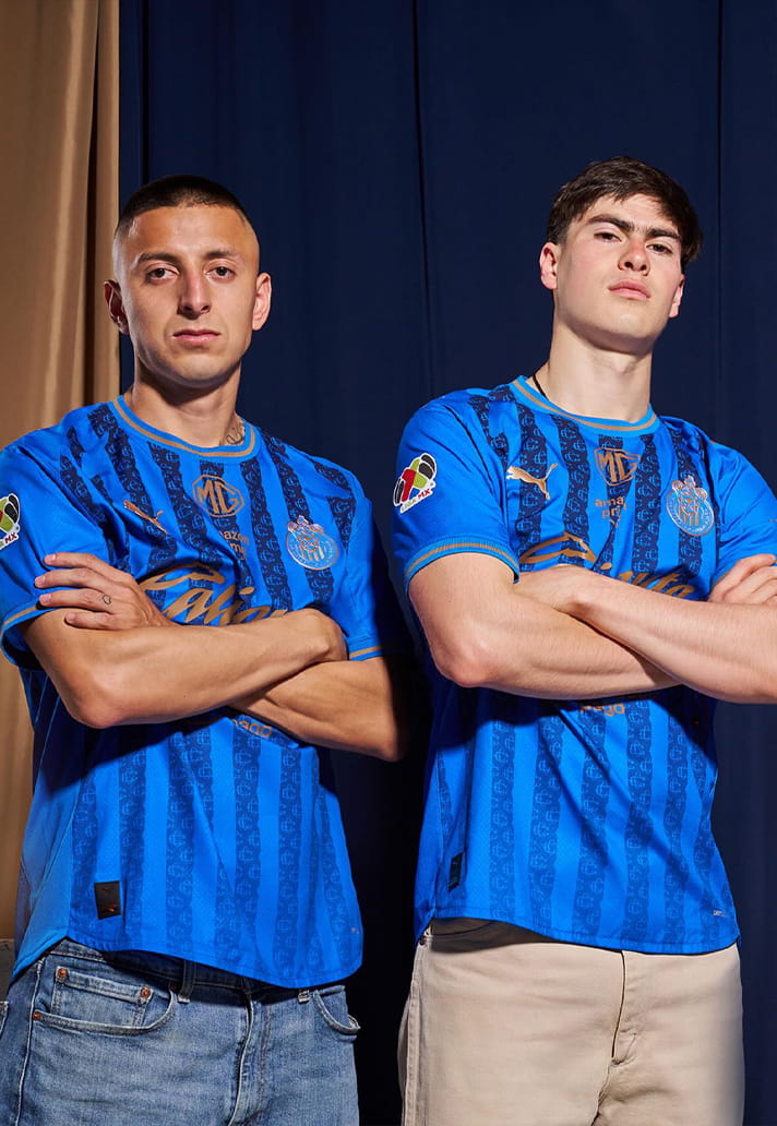 Landing in a bold royal blue, the new Chivas third kit design from PUMA immediately sets itself apart from the club’s iconic red and white. The base is dressed with vertical striping, but this isn’t your standard pinstripe affair — look closer and you’ll spot the club’s monogram subtly woven into the lines, fading out in a degraded pattern as they run towards the hem. It’s a refined detail that rewards a second glance, and one that gives the shirt a strong sense of depth and identity.