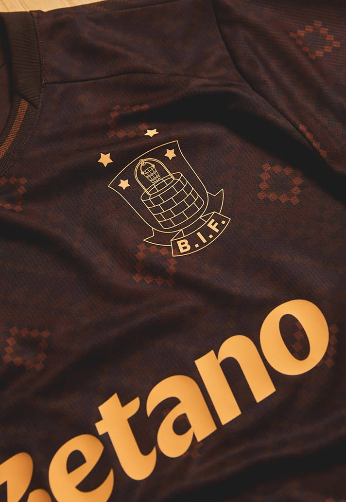 Brown isn’t a regular in the football‑shirt spectrum, but when a brand commits to the shade with conviction and craft, it becomes a statement. This one does exactly that. Brøndby’s 2025/26 third shirt arrives dipped in a rich, dark chocolate base, layered with an all‑over pixel‑art diamond pattern that plays out in multiple tones of brown. The result is a geometric flow that feels more couture than conventional, giving the jersey a street‑ready, fashion‑first aesthetic.