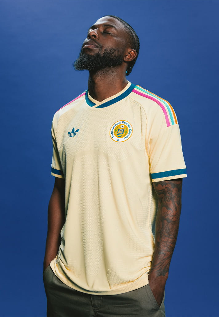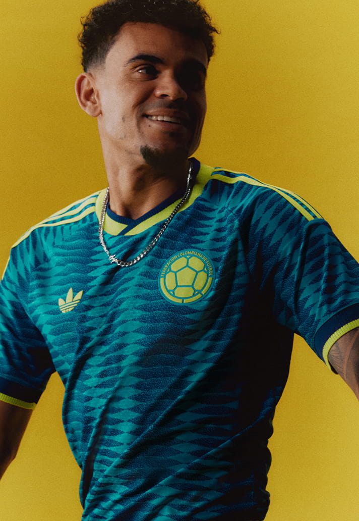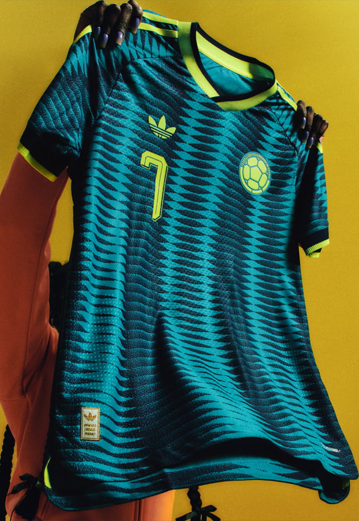 A bold yellow trim detailing across the 3-stripes, cuffs and logos, is mirrored in the word “COLOMBIA” across the back of the neck, evoking a sense of pride and connection to their land.