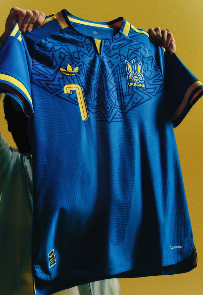 Influenced by contemporary Ukrainian design, the away jersey features a striking reinterpretation of traditional cultural elements and symbols, creating a bold fusion of heritage and innovation. The graphic sits proudly across the upper chest in a mystery ink colourway on a blue base, merging a vintage aesthetic with contemporary streetwear influences.