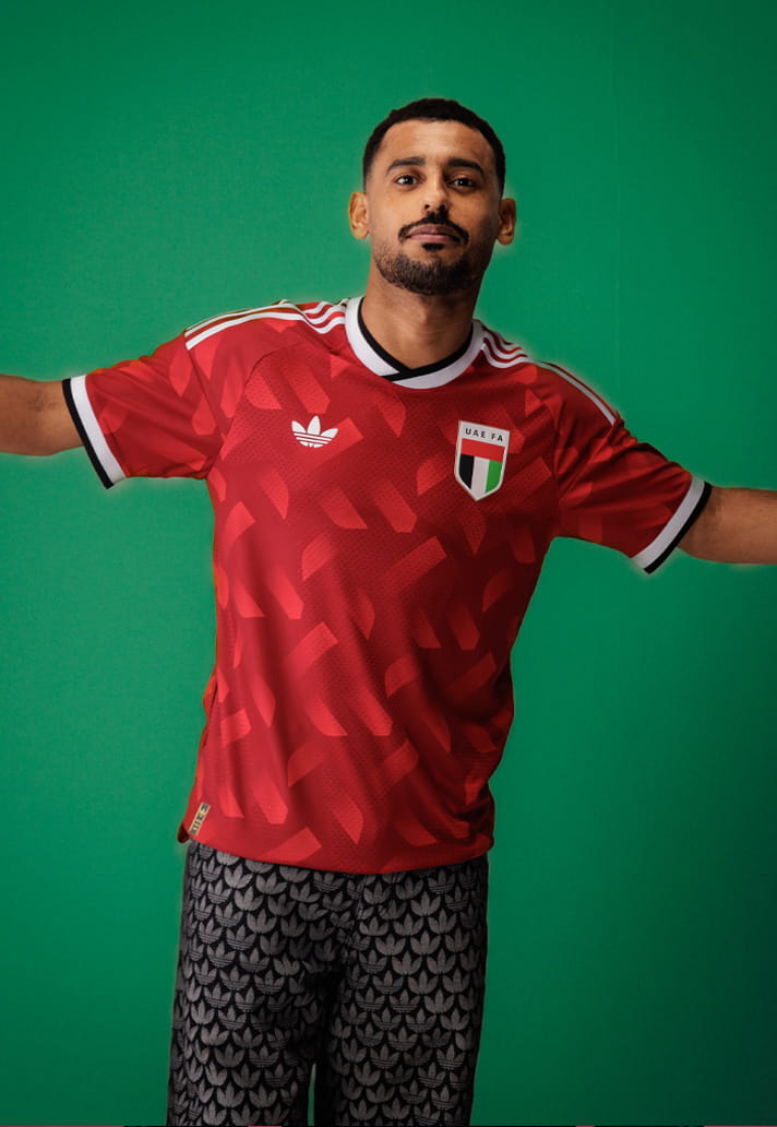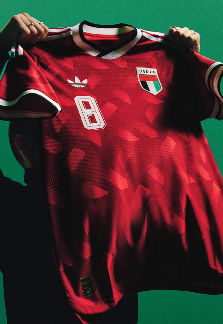The United Arab Emirates away jersey draw’s inspiration from the Federation’s logo mark. Set on a deep red base, the kit showcases a striking look with an all-over lighter red graphic, accented by crisp white trims. The geometric pattern takes its visual cues from the shield shapes found on the logo, embodying the spirit of the team. The nation’s flag adorns the back of the neck, serving as a proud finishing detail.