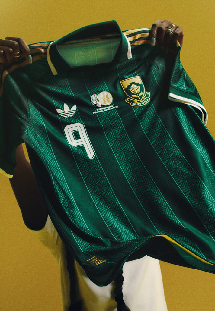The away jersey makes a bold statement in South Africa’s iconic green and gold – a combination of colours deeply rooted in their sporting identity. Blending heritage and sophistication, a traditional green forms the base with detailed white and gold trims on the collar, a tribute to the prestige and progression of football in the country.