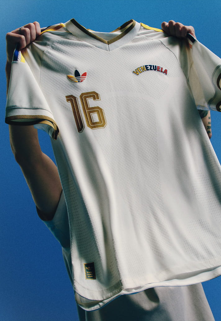 Paying homage to the federation’s history, the crisp white away jersey is punctuated by distinctive yellow, red and blue detailing that is carried through from the three stripes to logos and team badge. The crest features the word “VENEZUELA” in block letters on the left chest, the design reminiscent of the crest used between 1961 and 1967.