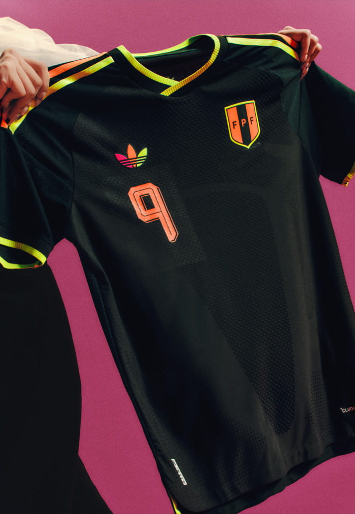 Celebrating Peru’s vibrant ‘Chicha’ design culture, often found on traditionally colourful posters and art, the away jersey adorns a black base complimented with a trefoil badge and three stripes on the shoulder in fluorescent colours – Magenta, Solar Yellow and Solar Orange.