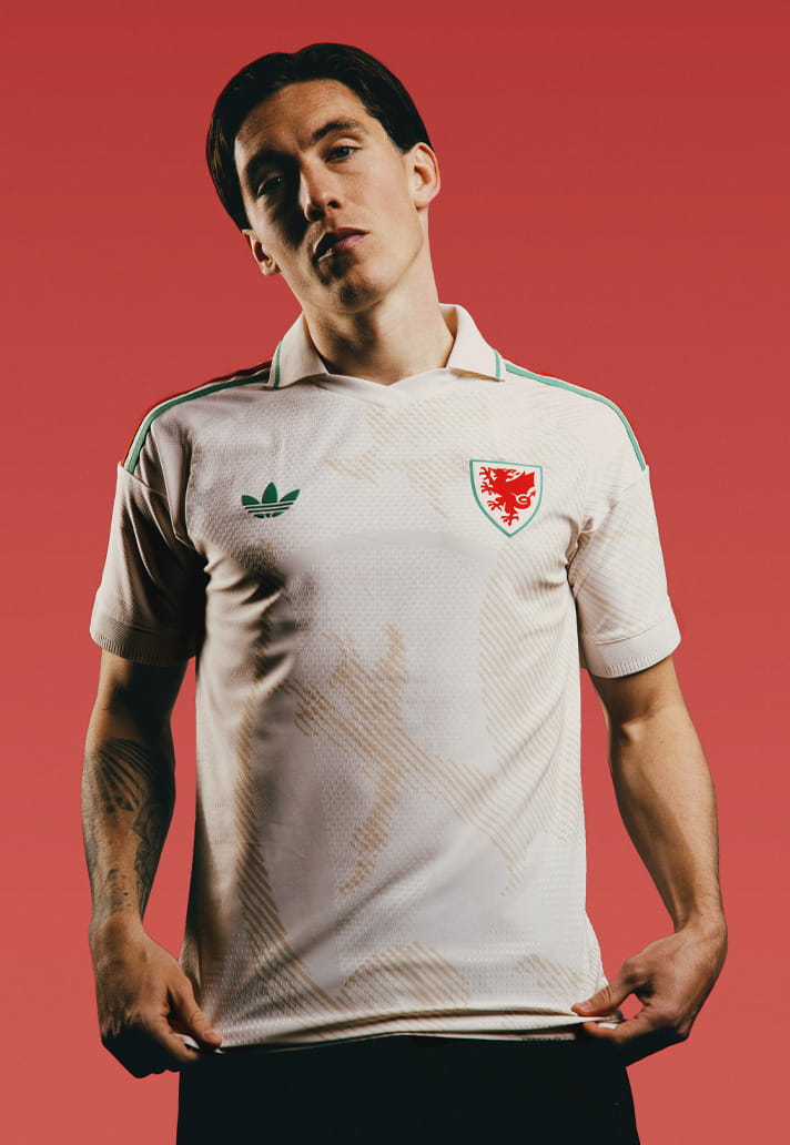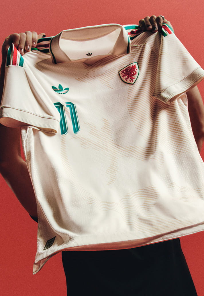 Celebrating the country’s identity and heritage, the Welsh away kit is built with a cream base punctuated with abstract graphical interpretations of the Welsh dragon, in muted red tones, detailed across the front of the jersey.