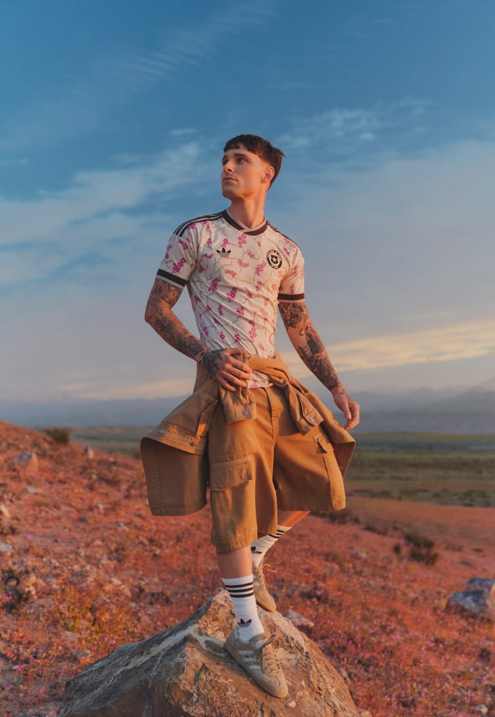 Chile’s away kit takes its look from the flowering desert, a rare phenomenon of the Atacama Desert. Celebrating the country’s unique natural landscape, striking pink flowers feature in an all-over graphic print on an off-white base, with subtle brown detailing representing the cracks from which they emerge.