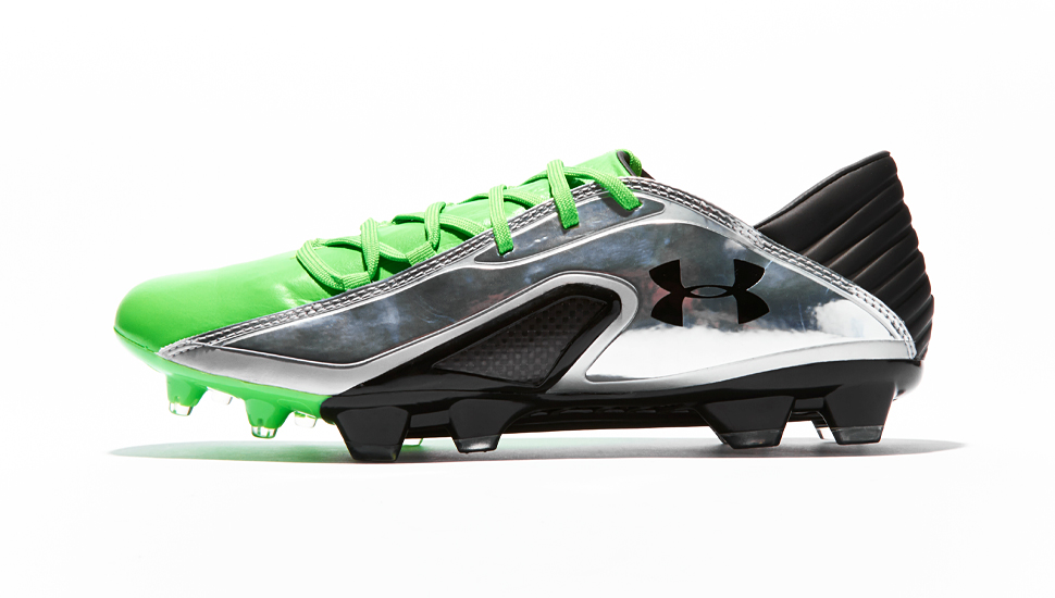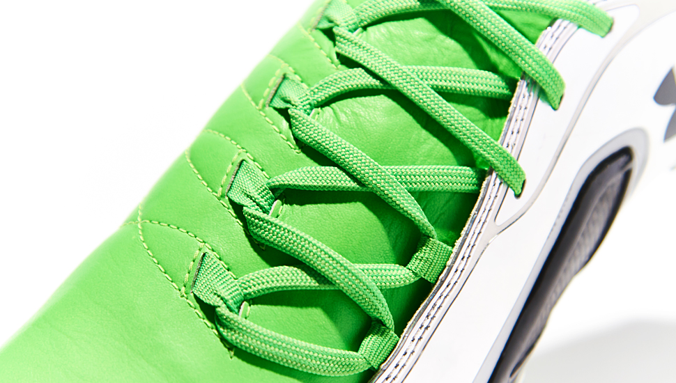 Despite the February launch of the Blur Carbon IV, Under Armour have made a surprise returned to the Blur Carbon III, giving the boot a “Poison/Silver/Black” colour-up. The colourway matches a green leather across the forefoot and medial side along with a metallic silver synthetic combined with a black anatomical heel. Continuing an out-of-date boot model is new to us, but if you’ve got a knackered pair of Blur Carbon III’s kicking around, today’s your lucky day. If you like green that is.