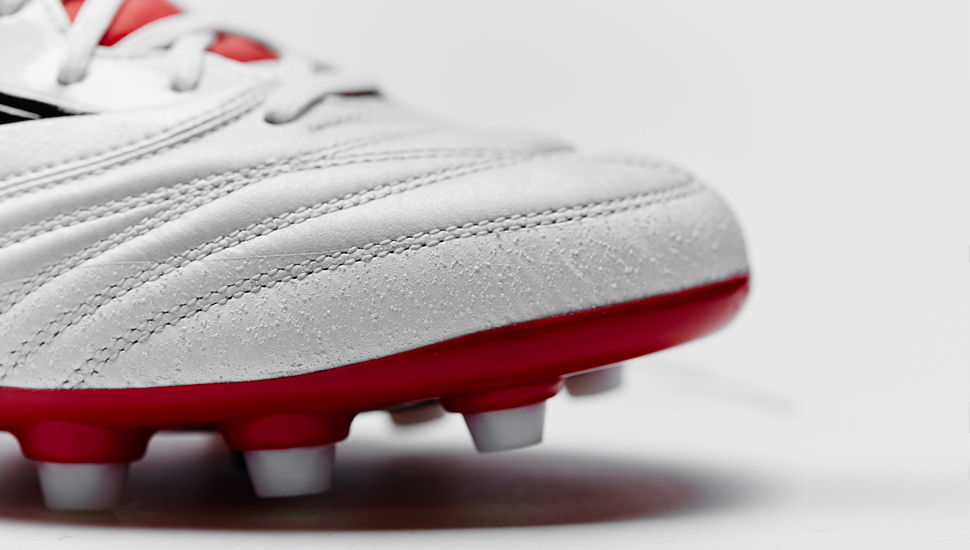 The Monarcida lands as a premium Mizuno product with a price-tag of £200, now bear with us while we try to justify that. The Monarcida is the latest addition to Mizuno's 'Made in Japan' collection which means it is lasted for 24 hours (it takes 20 minutes to make a standard boot) to take comfort and fit to the next level. The upper is leather in the vamp area with an abrasive sand-paper like print layer to the toe area for increased durability. The side quarters are made from a synthetic material to hold the foot in place and to keep weight to a minimum.