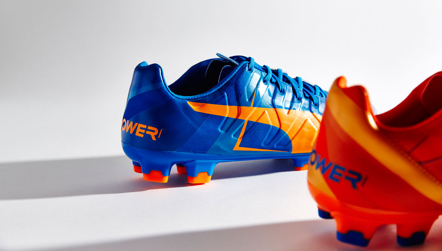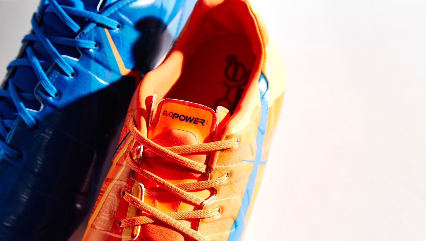 Reversing the pattern of the evoSPEED SL the left evoPOWER is orange and the right one blue with corresponding Form-stripes and studs. The Head-To-Head Duality boots feature additional graphics on the upper and will be worn by all contracted PUMA athletes for three games of over the course of the season as PUMA put their evoSPEED and evoPOWER players up against each other using a fantasy-football-esque scoring system.