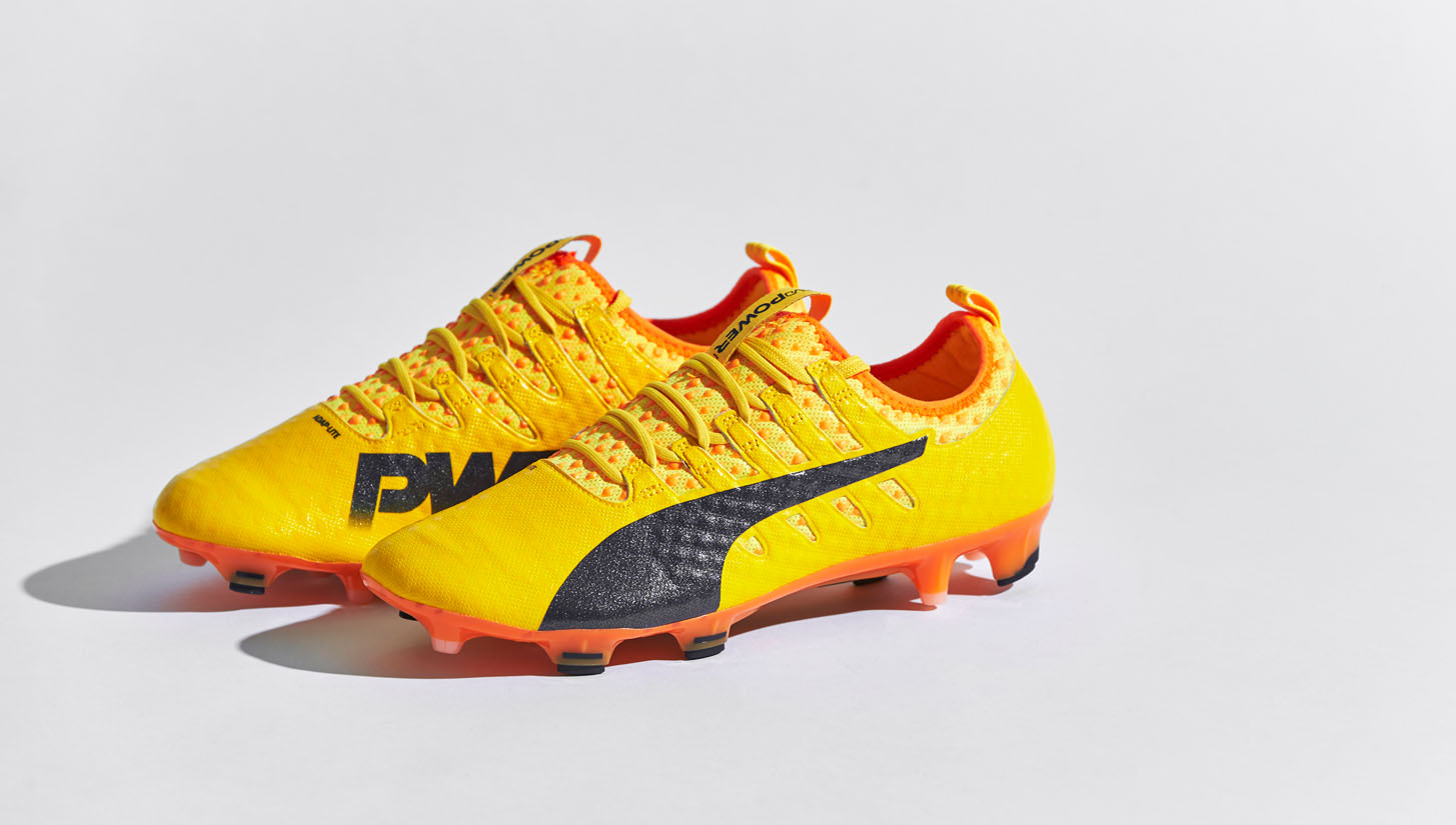 PUMA roll out their Spring 2017 collection of on-pitch colours in vibrant style by throwing shades of sunshine at their leading silos. The evoPOWER Vigor 1 connects with a fist full of fruit in a punchy "Ultra Yellow/Peacoat/Orange Clown Fish" combo.