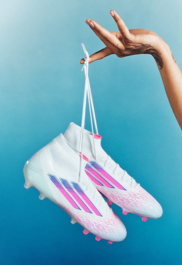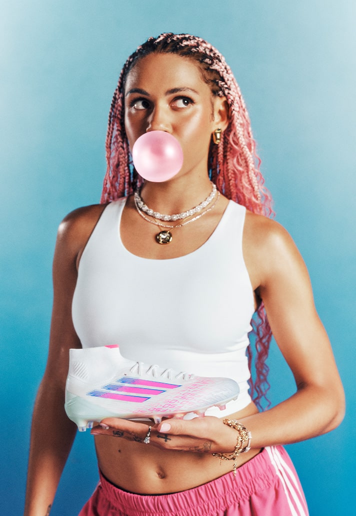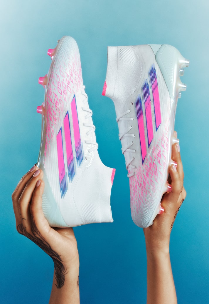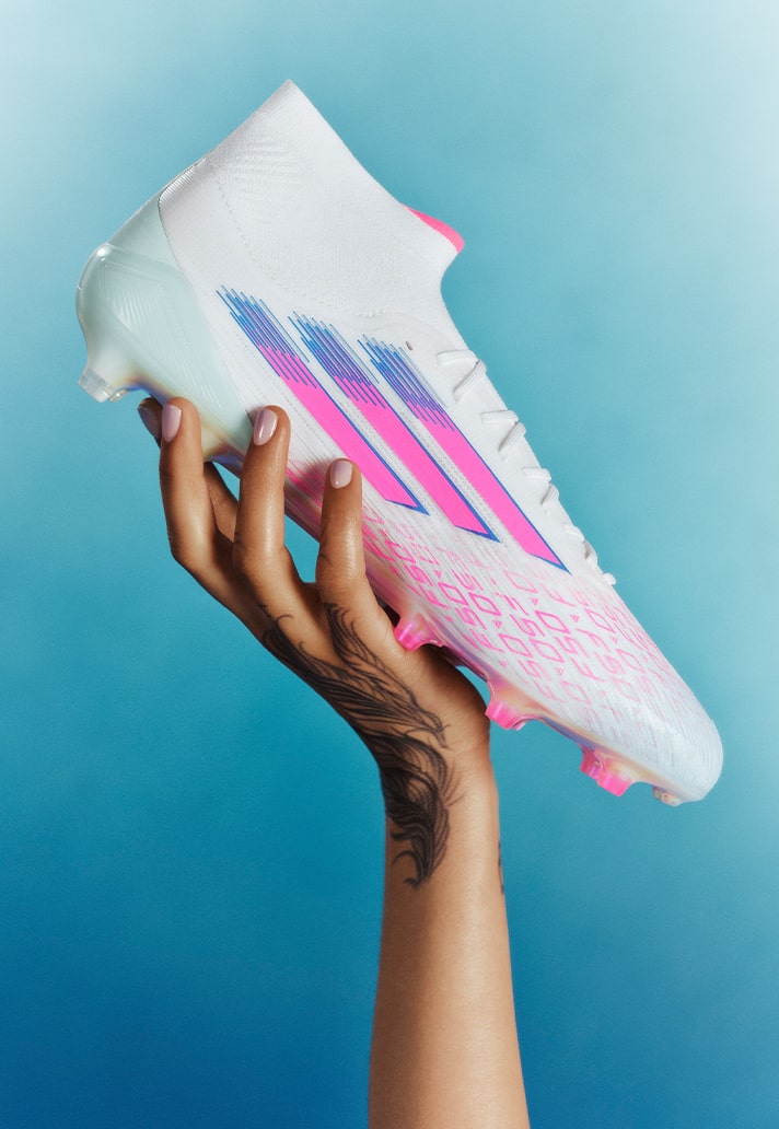 Style meets substance in every angle of the Sparkfusion. Inspired by Rodman’s favourite aesthetic cues, the boot comes dressed in a pearlescent white base, an instant nod to her long-standing love of clean white boots. Splashed across the upper, bold pink Three Stripes pay tribute to her signature long pink braids, while light blue detailing – from the heel counter to the collar – threads through the design, matching her distinct flair both on and off the pitch.