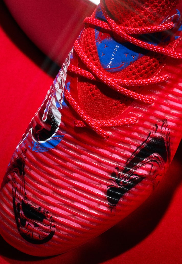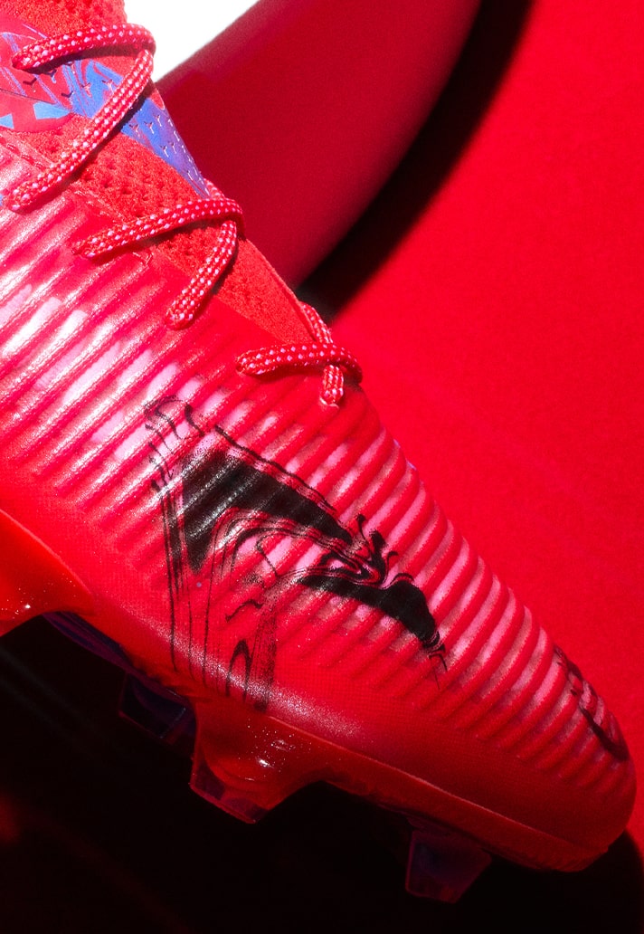 From the first glance, it’s clear these aren’t boots for wallflowers. Music-inspired graphics dance across the surface, channelling the feeling of taking control of the game and bending it to your tempo. Every detail screams expression, from the colour pops to the aggressive layering of tech under the hood.