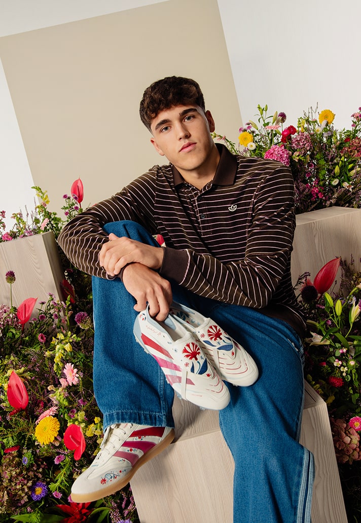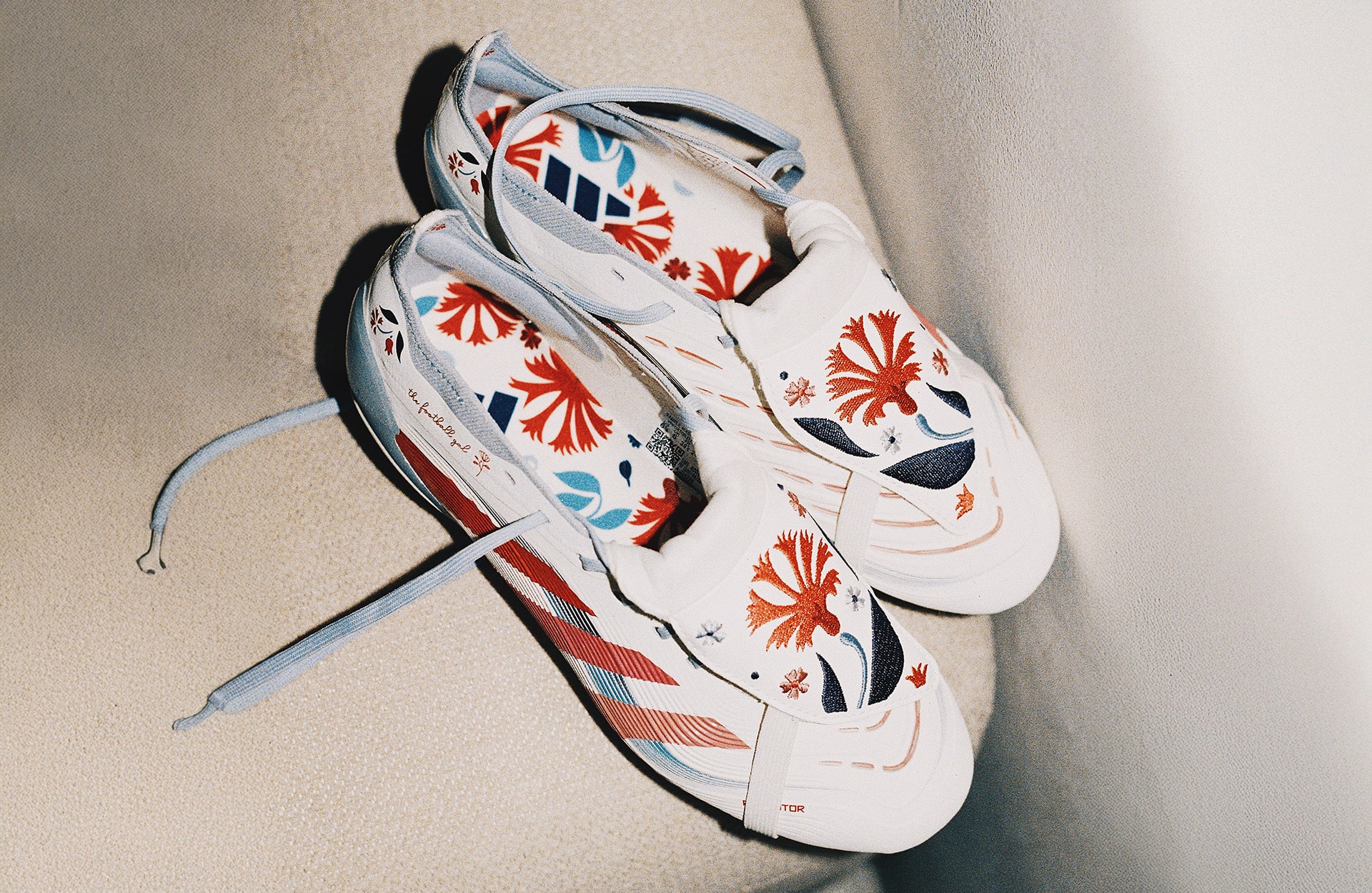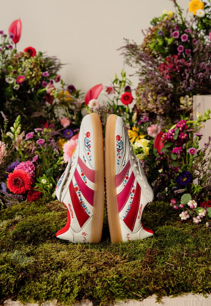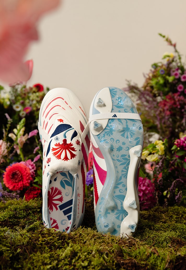 Visually, this boot is showstopper. The upper is dressed in a clean white suit, with those unmistakeable adidas stripes braking through in waves of soft pink and red. Hand-embroidered florals, inspired by the deep-rooted Spanish flower of carnations, bloom across the upper through blue and crimson threads. Every detail hits with precision. And the eye catcher of the piece – the stitched floral design that swirls across the iconic Predator tongue. Stunning.