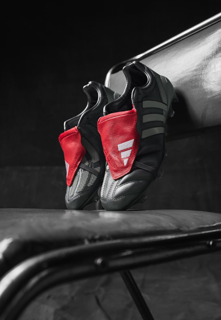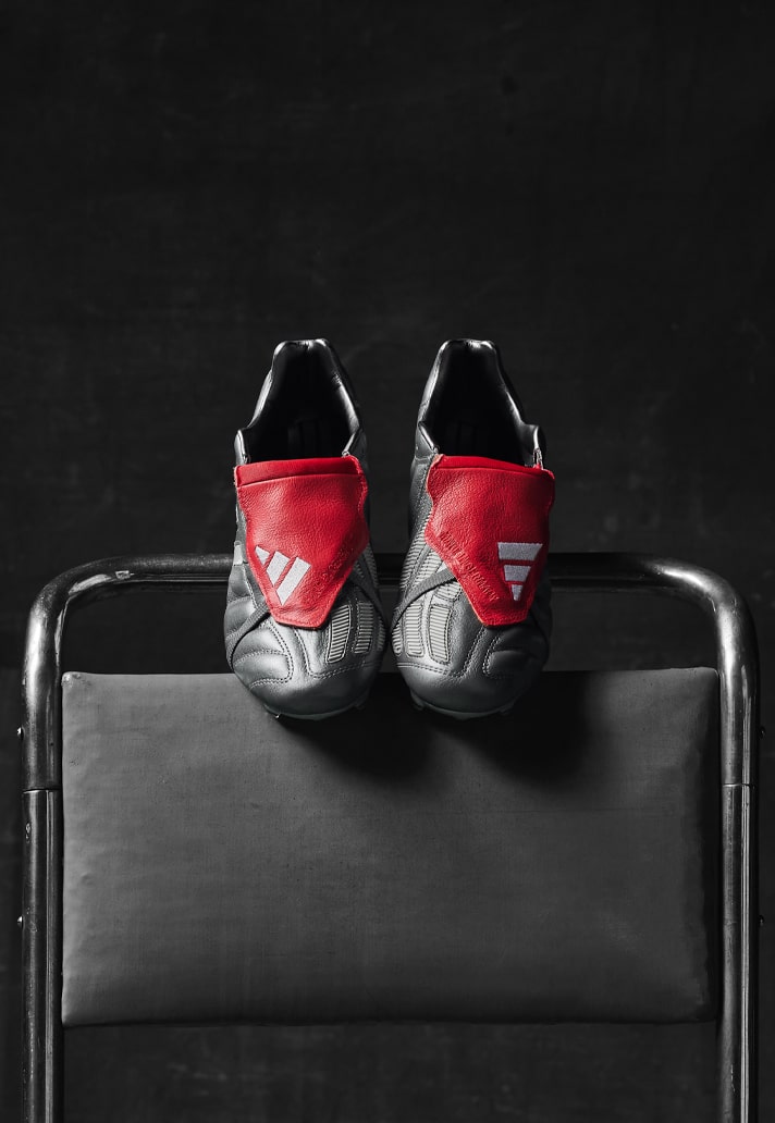 This isn’t nostalgia for nostalgia’s sake. It’s a reconstruction. adidas have returned to the original 2002 blueprint with almost obsessive accuracy: the metallic Gunmetal grey upper, the Predator rubber elements wrapped across the forefoot, the silver Three Stripes slicing through the shape, and of course the fold-over tongue flashing that unmistakable hit of Pure Ruby red. It looks like the boot you remember, because it is the boot you remember.